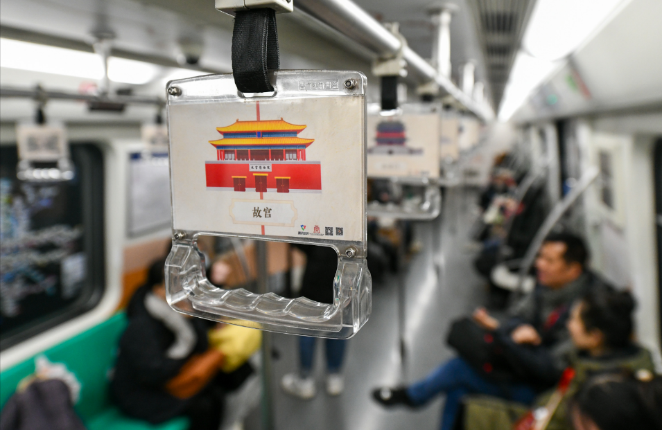 参与设计的北京印刷学院设计艺术学院教师余文婷介绍,专列的车门海报增加了渐变色彩元素,添加了各个建筑点位介绍,让乘客了解建筑背后的历史故事。“主题专列的主题是‘韵律中轴’,我们希望在车厢内外打造一个具有韵律和节奏感的中轴线,来展现中轴线的独特魅力,让乘客感受到北京中轴线的历史文化底蕴。”