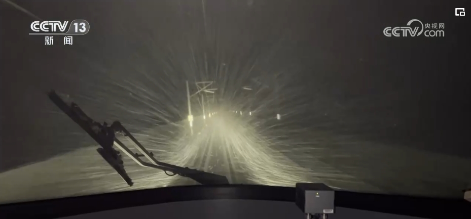 从零时15分开始到清晨4点多,热滑除冰车分别驶过郑州东、黄河大桥、新乡和南乐,车窗外白雪皑皑,视线和视野都受到限制。一路上,雨滴和雪粒不断敲打着车窗,从接触网上掉落的冰碴,不断落在车顶上砰砰作响,铜基受电弓在结冰的接触网上拉出长长的电弧,噼里啪啦电光四射。