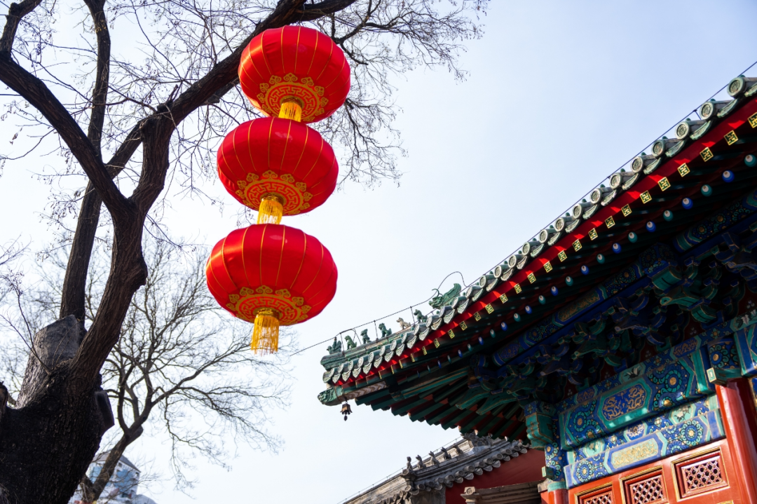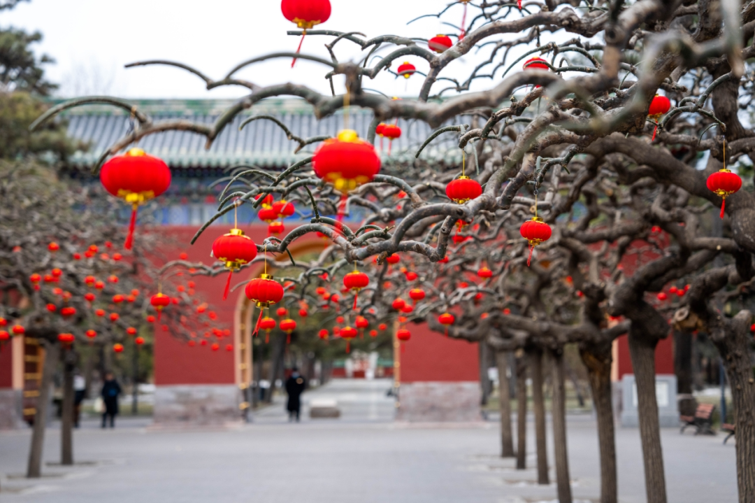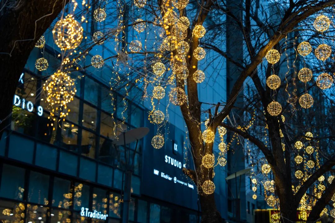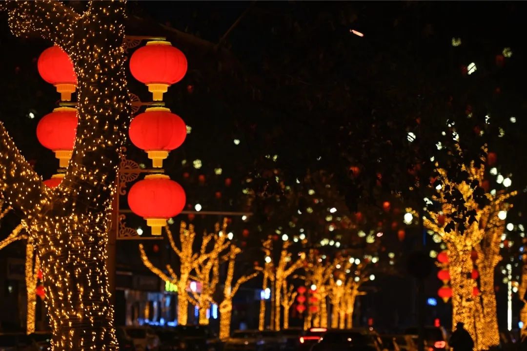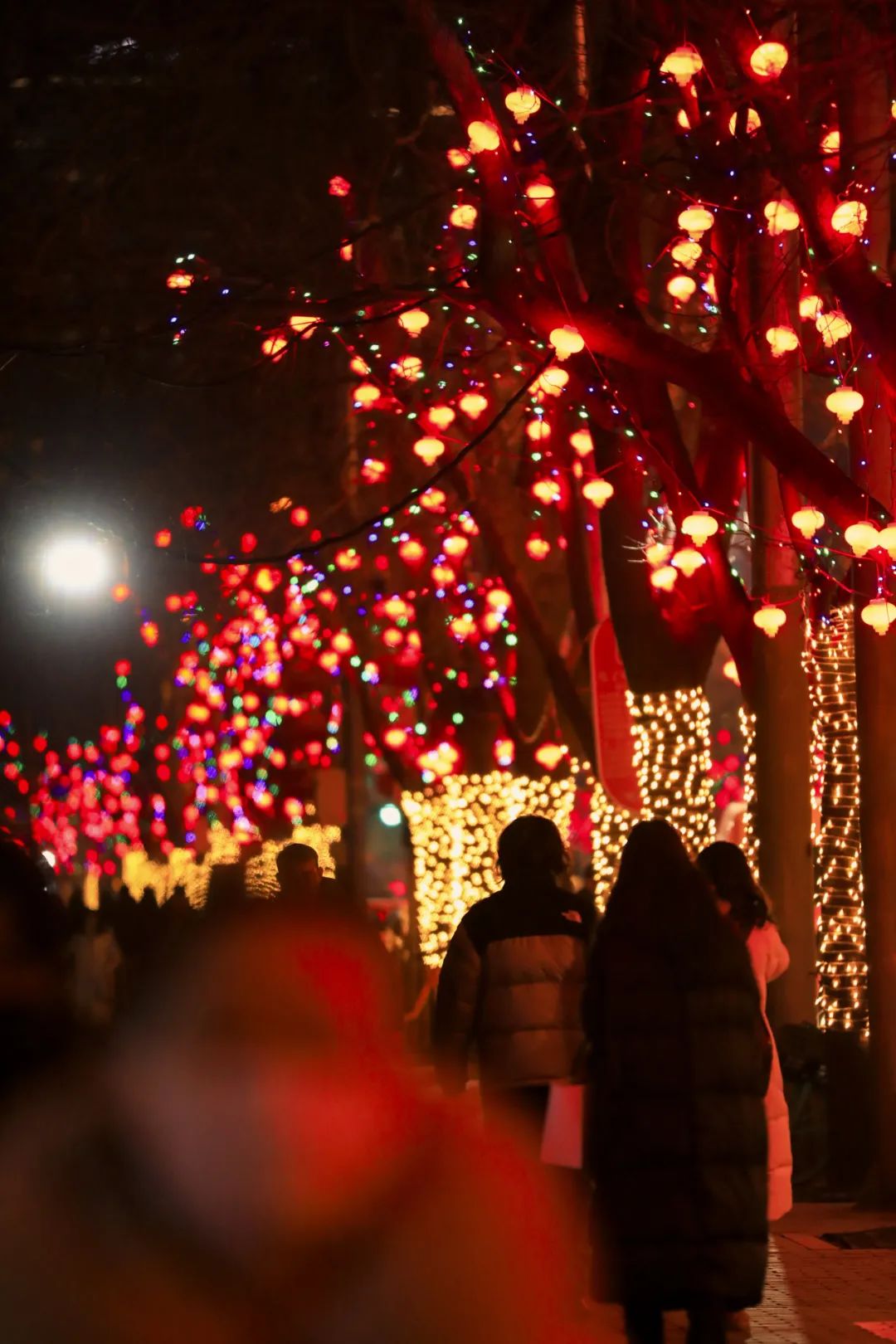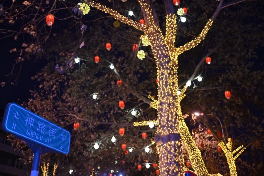 火红的灯笼、靓丽的花坛、金光闪闪的树木