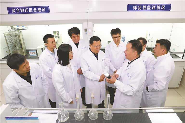 图为程杰成院士(右二)带领大庆油田化学驱油技术研发团队在实验室工作。 大庆油田纪委供图