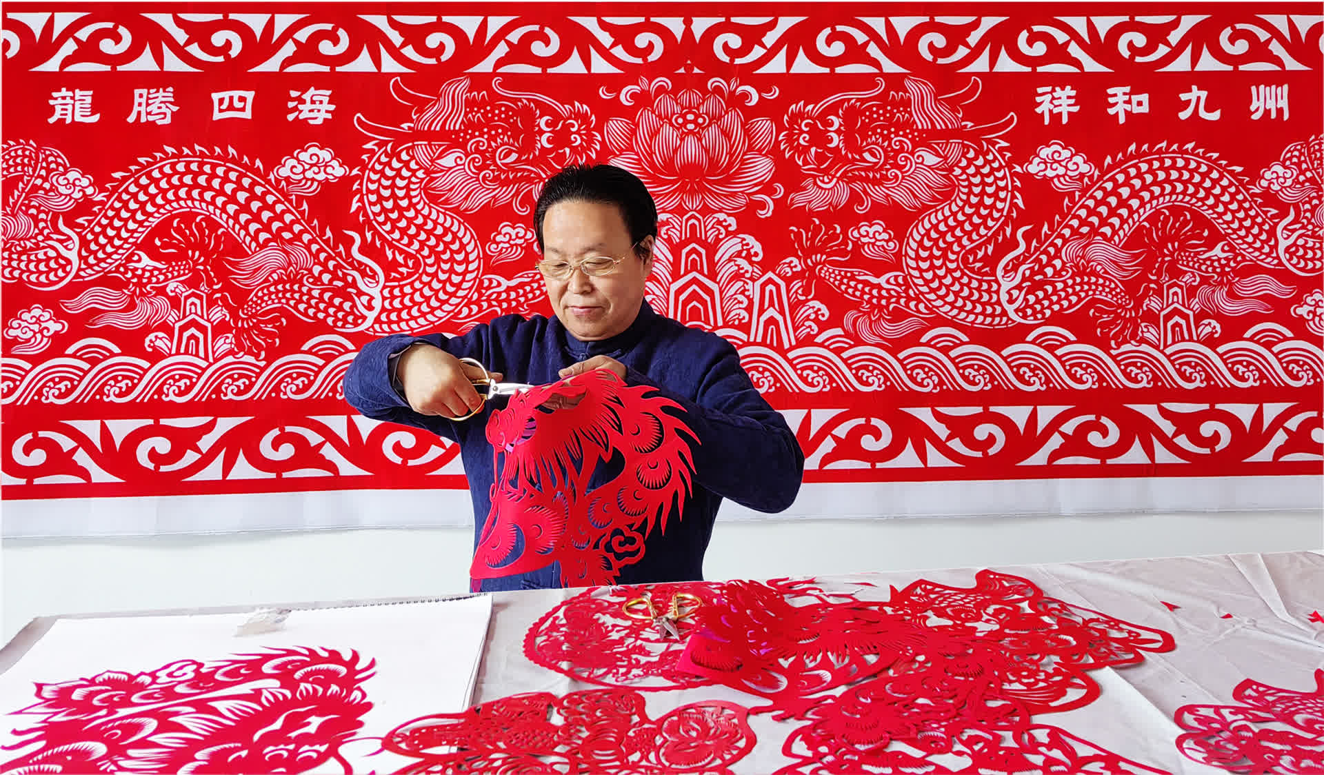 2024甲辰龙年春节将至,中国五花剪纸非遗传承人张彦创作长4米、宽1米巨幅龙年贺岁剪作品表达传统艺人对新春的祝福。