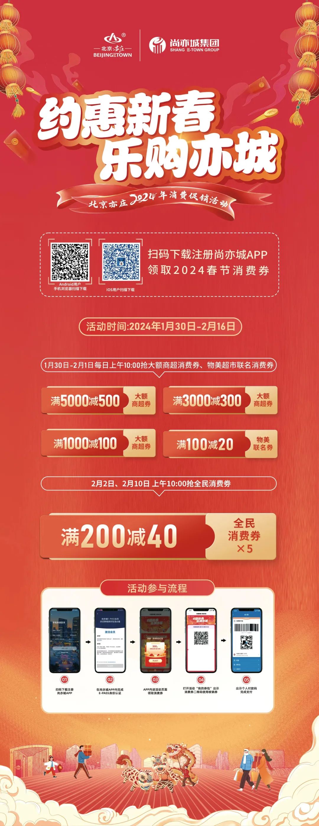 北京经开区第三轮消费券将于2月10日(大年初一)上午10点发放。此次发放为全民消费券,包含餐饮在内的合作商户均可使用。每份全民消费券包含5张满200元减40元券,可叠加使用,每人限领1份。