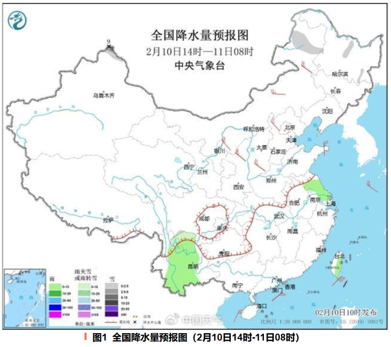 10日下午至夜间,新疆北部、内蒙古东北部、黑龙江北部和东南部、川西高原南部、云南西北部等地部分地区有小到中雪或雨夹雪,新疆北部局地大雪(见图1);四川南部、云南大部、江苏中南部等地的部分地区有小雨。