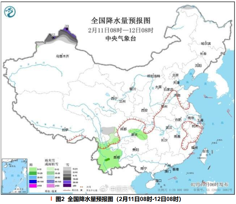 2月10日中午至11日中午,受降雪(雨夹雪)和低温天气影响,滨绥线(帽儿山-下城子)、成昆线(铁西-西昌)等铁路线路注意防范有坡度线路区间和道岔部位的积雪和积冰的不利影响。受大风影响,青藏线(唐古拉-拉萨)等铁路线路需注意防范桥梁或开阔地区的列车晃动、信号异常的不利影响。