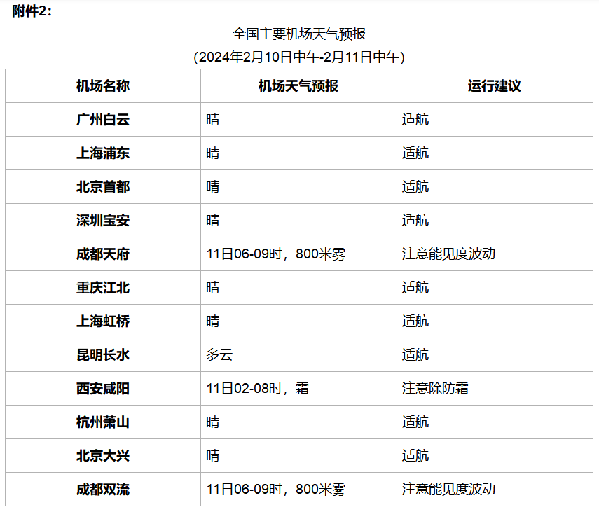 10日中午至11日中午,全国大部机场适航(见附件2);11日凌晨至早间,双流、天府、武汉、合肥、南京、青岛等机场有雾,哈尔滨、长春、沈阳、大连、青岛、西安等机场有霜。