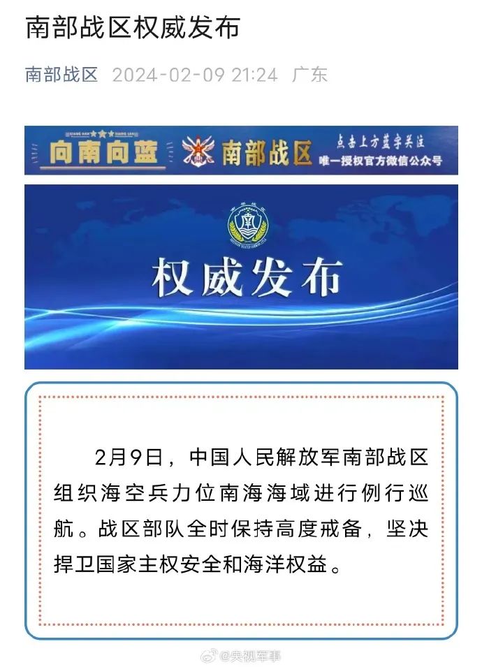 “2月9日,中国人民解放军南部战区组织海空兵力位南海海域进行例行巡航。战区部队全时保持高度戒备,坚决捍卫国家主权安全和海洋权益。”