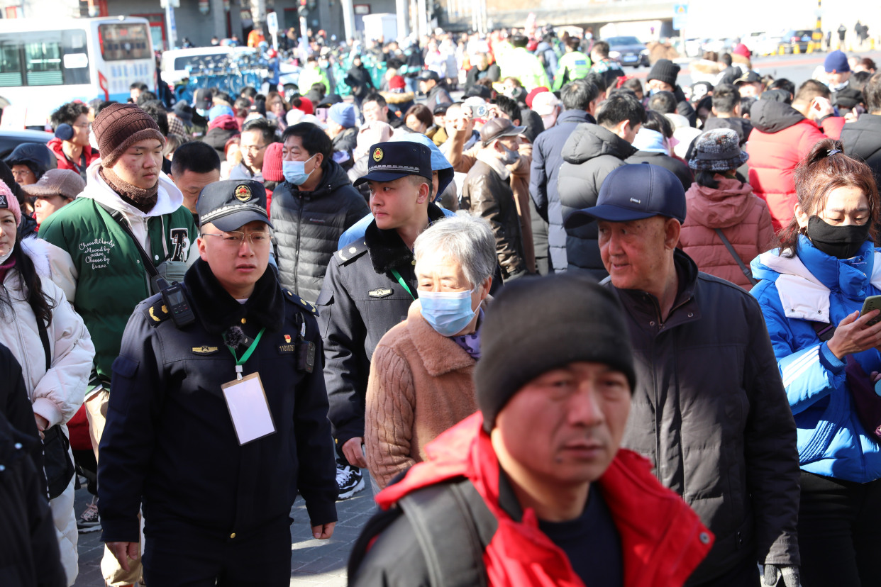 2月10日早上5点半,记者看到雍和宫大街前往雍和宫敬香祈福的人群络绎不绝,在工作人员的引导下有序排队等候,围绕雍和宫周围环境秩序各保障点位的城管执法人员已开展盯守工作。