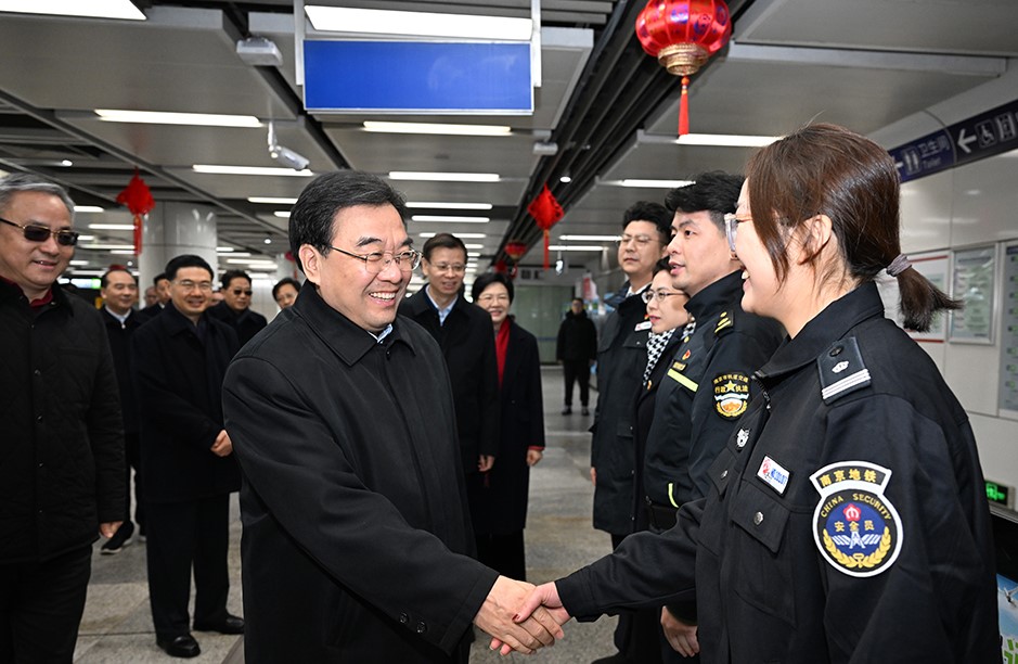 江苏省委书记信长星在地铁站看望一线工作人员。中国江苏网 图
