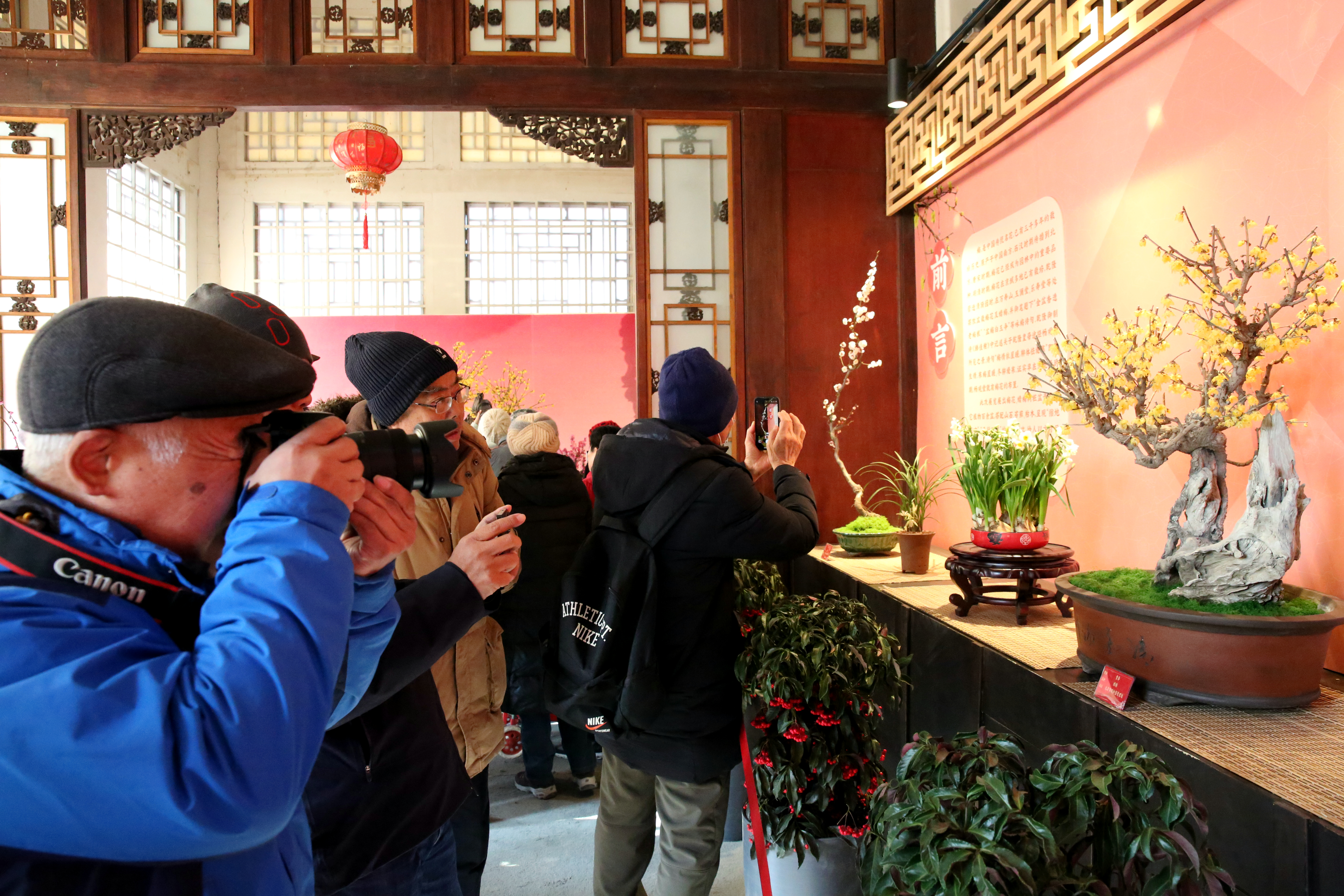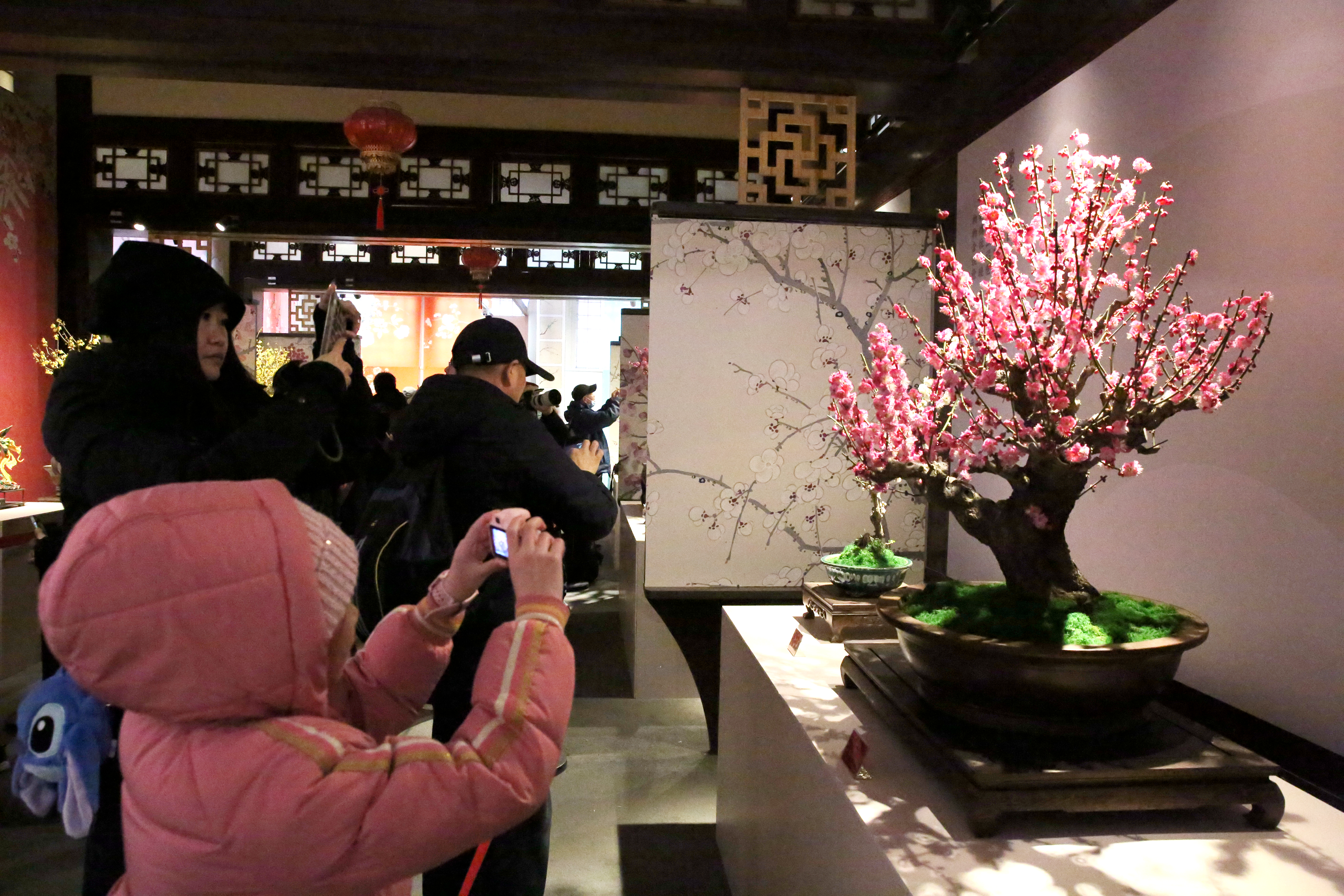 “傲骨幽香”梅花蜡梅文化展是颐和园春节期间的传统文化项目,至今已经是第十三届,深受市民游客喜爱。展出的梅花、蜡梅树桩盆景以及其他植物百余盆,依照皇家园林风格特点创作出直干式、斜干式、悬崖式、丛林式等传统造型,重点展品梅桩树龄在百年以上。展览还重点打造了古人赏梅的意境之美,盆景隔断上有古画古诗词,背景帷幔颜色取材于长廊苏式彩画,桃红、杏黄、石绿、月白、天青……让游客走进展厅不仅能感受春意盎然,还能品味浓浓的传统文化气息。