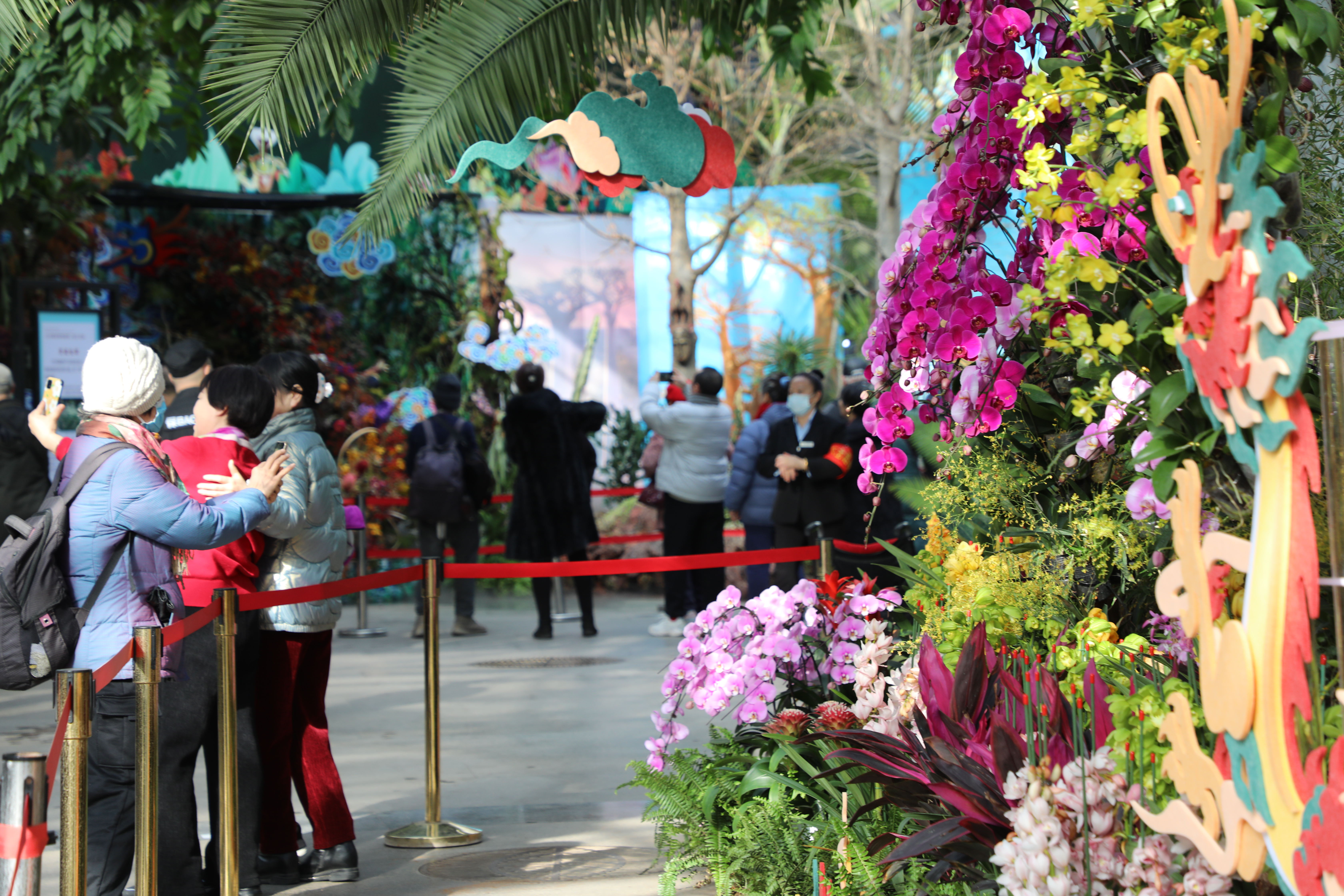 热带展览温室是本次兰花展的主要展区。鲜花组建的多个不同主题的区域各具特色。精品兰展示区,汇聚了国家一级保护植物美花兰,植物园培育的兰花新品种“辉煌”石斛,造型奇特的大魔鬼石斛等众多兰花品种。很多品种都是首次展出。中心花园区域展示竹艺“龙”花卉小品,成为新春打卡胜地。蝴蝶厅展区的龙头风筝、燕子风筝成为孩子们的童趣乐园。兰花凤梨室展区让游客仿佛置身于“兰”色海洋。