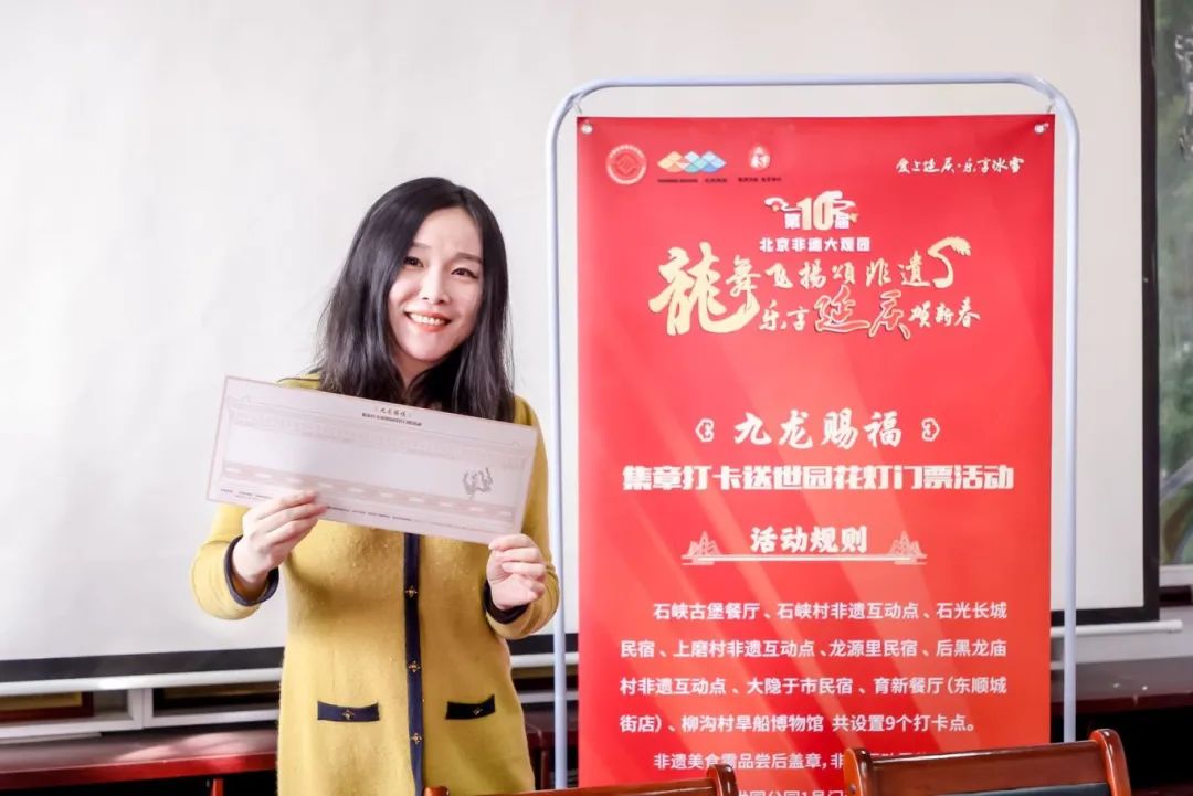 值得一提的是,本届北京非遗大观园活动还推出了“九龙赐福”集章打卡兑世园花灯门票活动,2月11日至14日,游客在石峡古堡餐厅、石峡村非遗互动点、石光长城民宿、上磨村非遗互动点、龙源里民宿、后黑龙村非遗互动点、大隐于市民宿、育新餐厅(东顺城街店)、柳沟村旱船博物馆打卡点集齐9枚印章即可到世园公园兑换“世园花灯门票”。