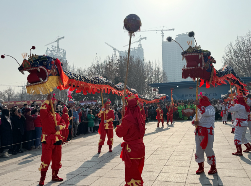 下午2点20分,趁着队员们休息的工夫,“运河龙灯会”传承人谢兆亮走到人群中介绍起来:“我们来自漷县镇张庄村。您看的这个表演,是咱们的市级非遗,最早可以追溯到1834年,也就是清道光十四年。过年了,希望我们的表演能给大家增添年味儿。”