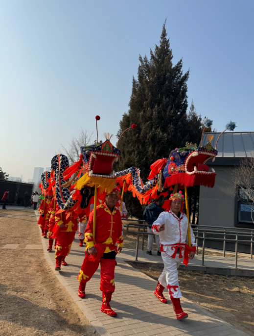 锣鼓队里负责打镲的金荣声今年68岁,之前舞过6年龙头。“每年春节,大伙儿都盼着来运河文化广场表演。这儿比村里还热闹!”老金说。今年正月初一,“运河龙灯会”的队员们带着巨龙走街串巷,家家户户都出来看,还有的人家在门口摆上茶桌,笑盈盈地欢迎巨龙进院子里舞两圈。“我还记得,4年前是我第一次出村表演,来的就是运河文化广场。当时我舞龙头,好多相机围着拍,真的跟当明星一样。”老金说。