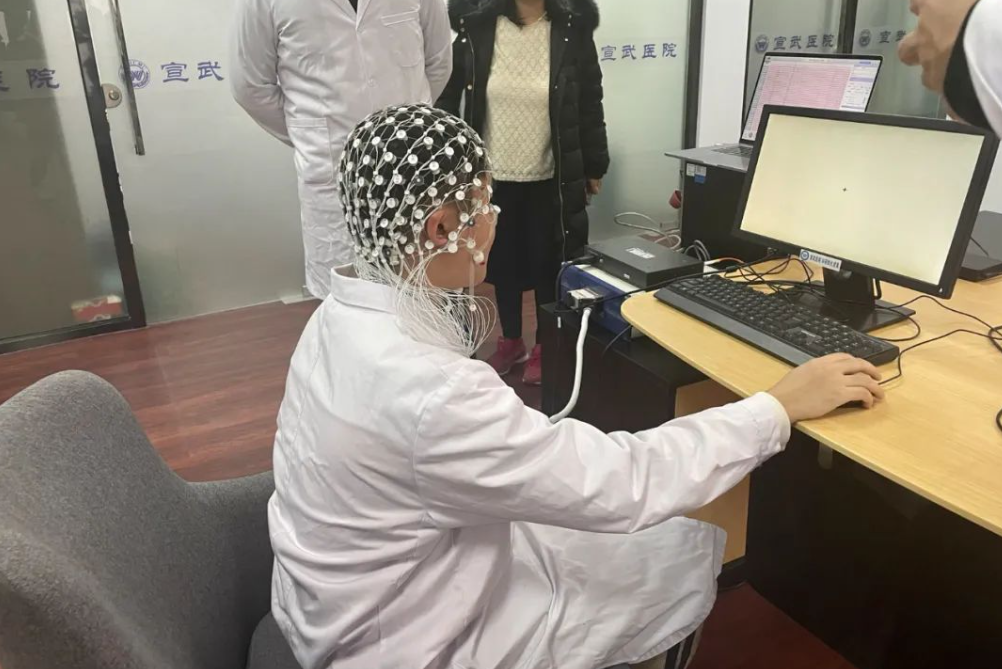 首都医科大学宣武医院类脑智能临床转化研究中心工作人员演示相关器械。