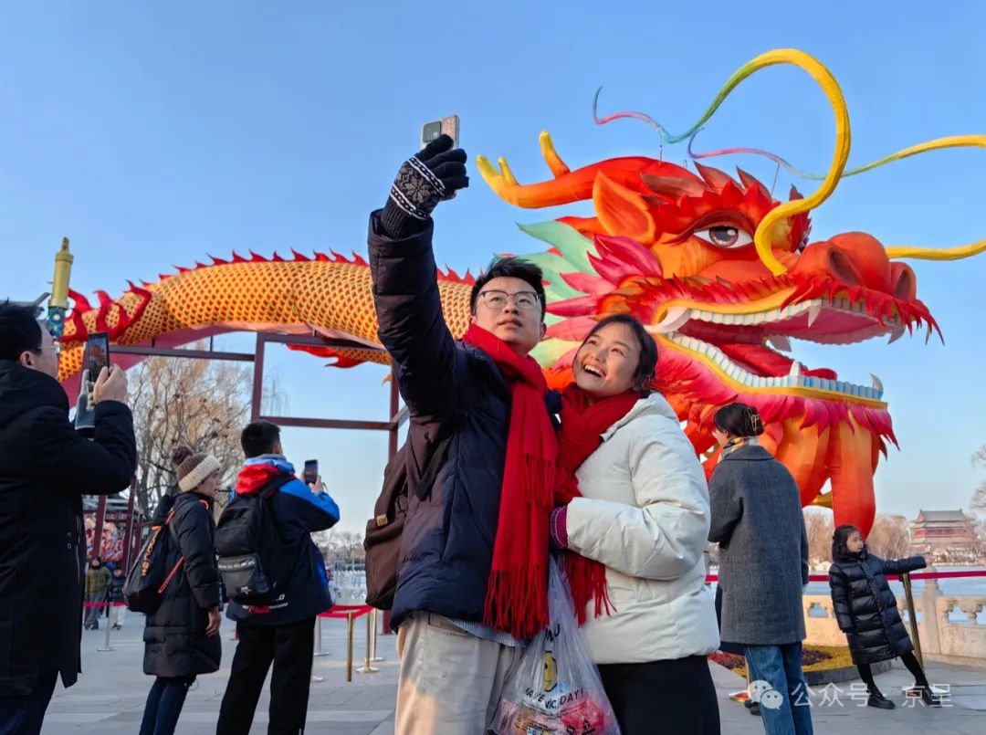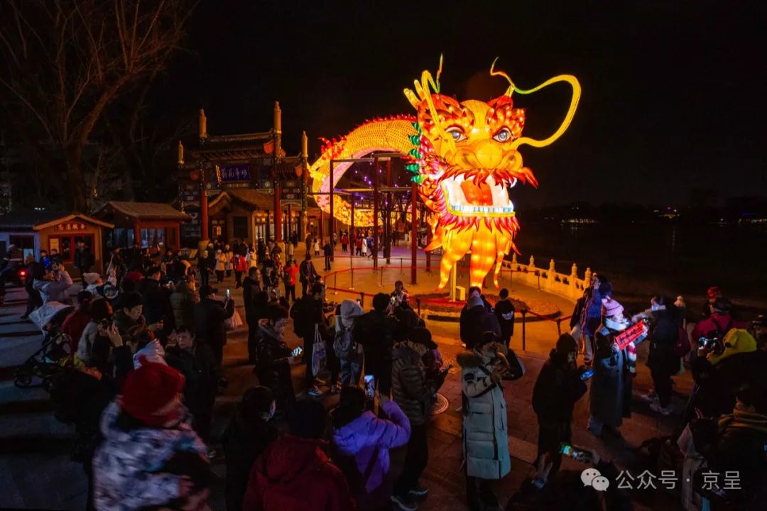 龙年春节,什刹海荷花市场以“蛟龙出海”为主题的巨型龙灯格外引人注目,吸引不少游客打卡拍照。曹胜 摄
