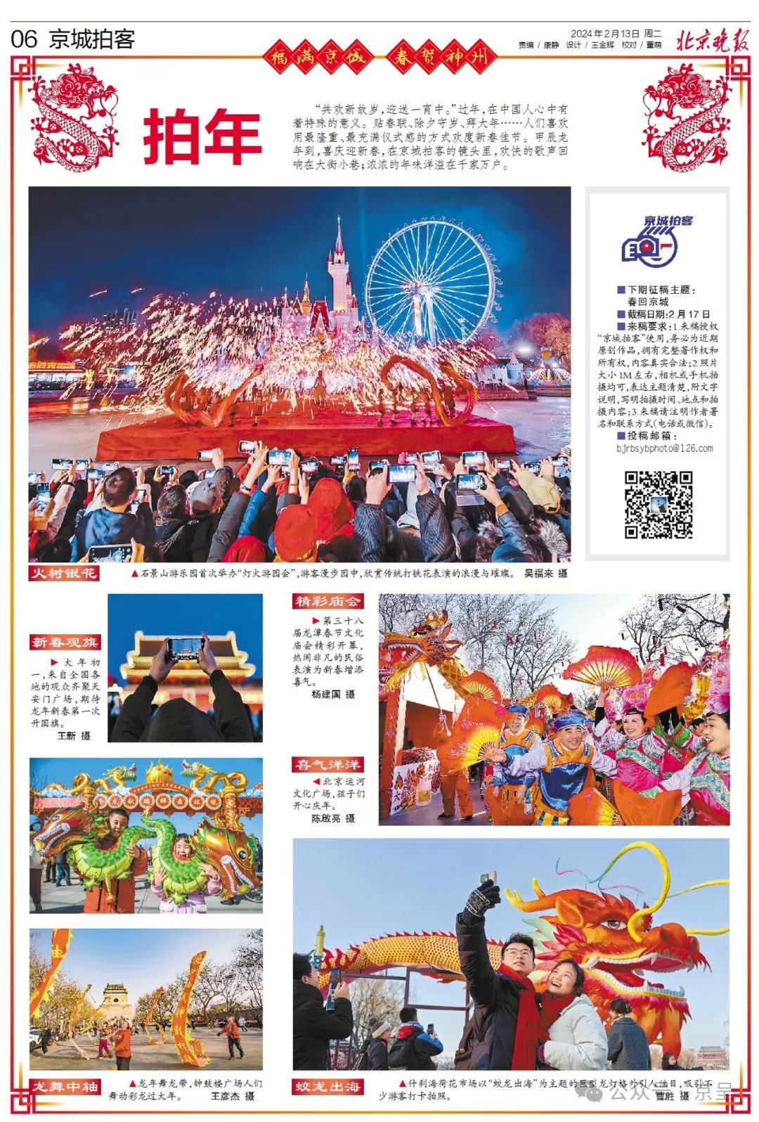 “共欢新故岁,迎送一宵中。”过年,在中国人心中有着特殊的意义。贴春联、除夕守岁、拜大年……人们喜欢用最隆重、最充满仪式感的方式欢度新春佳节。甲辰龙年到,喜庆迎新春,在京城拍客的镜头里,欢快的歌声回响在大街小巷;浓浓的年味洋溢在千家万户。