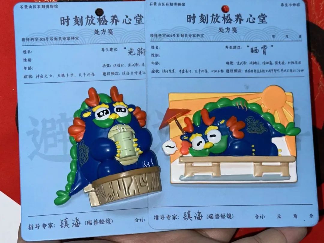 一进到石景山区石刻博物馆就可以看到自汉代以来石景山地区出土的精湛、细巧的石刻文物,艺术和欣赏价值极高。观赏石刻文物,品味历史印记。为了迎接新春,石刻博物馆特地推出了“时刻放松养心堂”文创品牌与“镇海老中医”的文创IP,在博物馆里,您可以近距离观赏健硕俏皮的马儿、可爱呆萌的石虎和威风凛凛的龙;还可以将写着“养生秘籍”的“镇海”冰箱贴和瑞兽“镇海”毛绒玩具带回家,呆萌可爱的小神兽难道还不能俘获您的心吗......