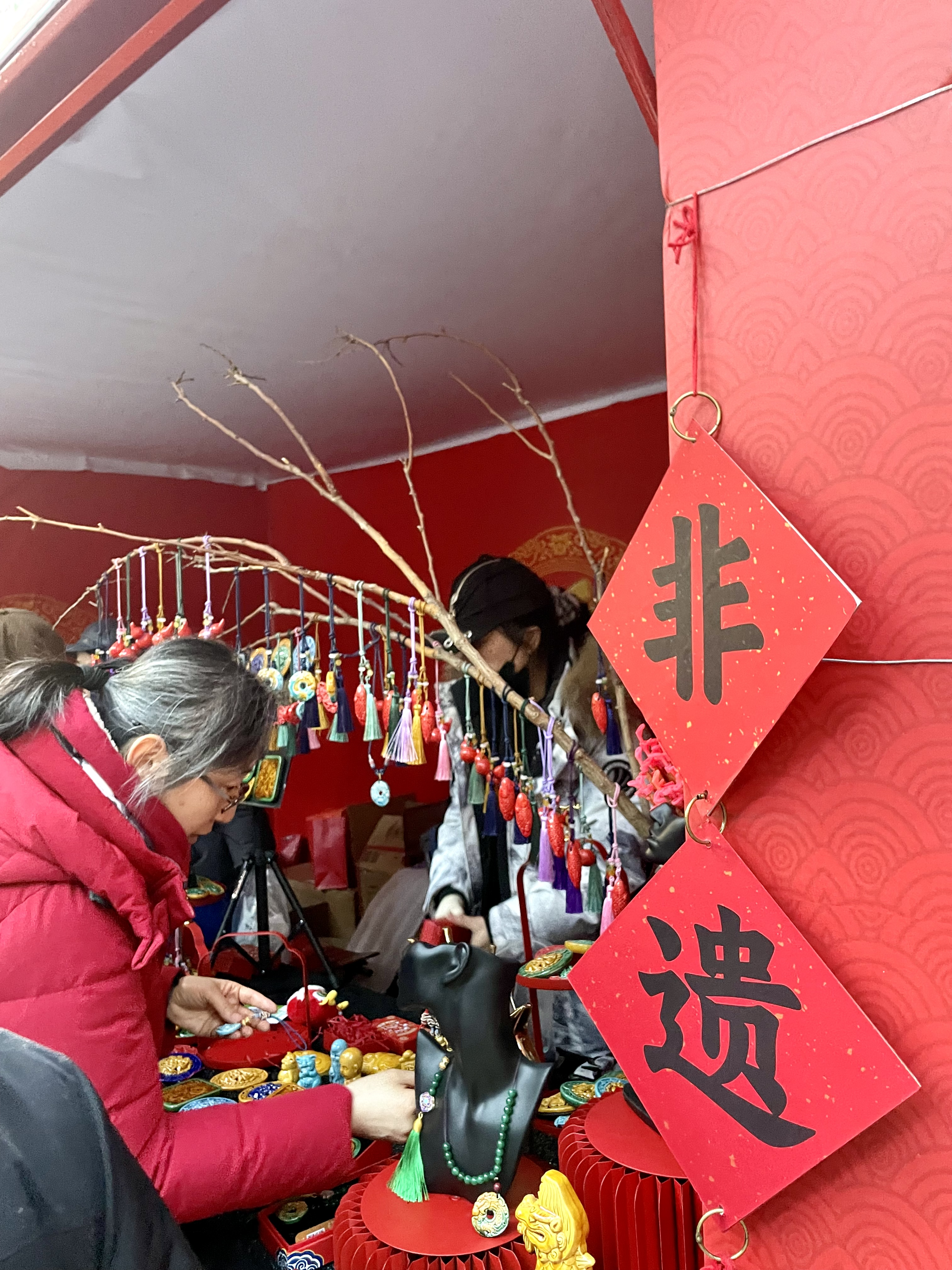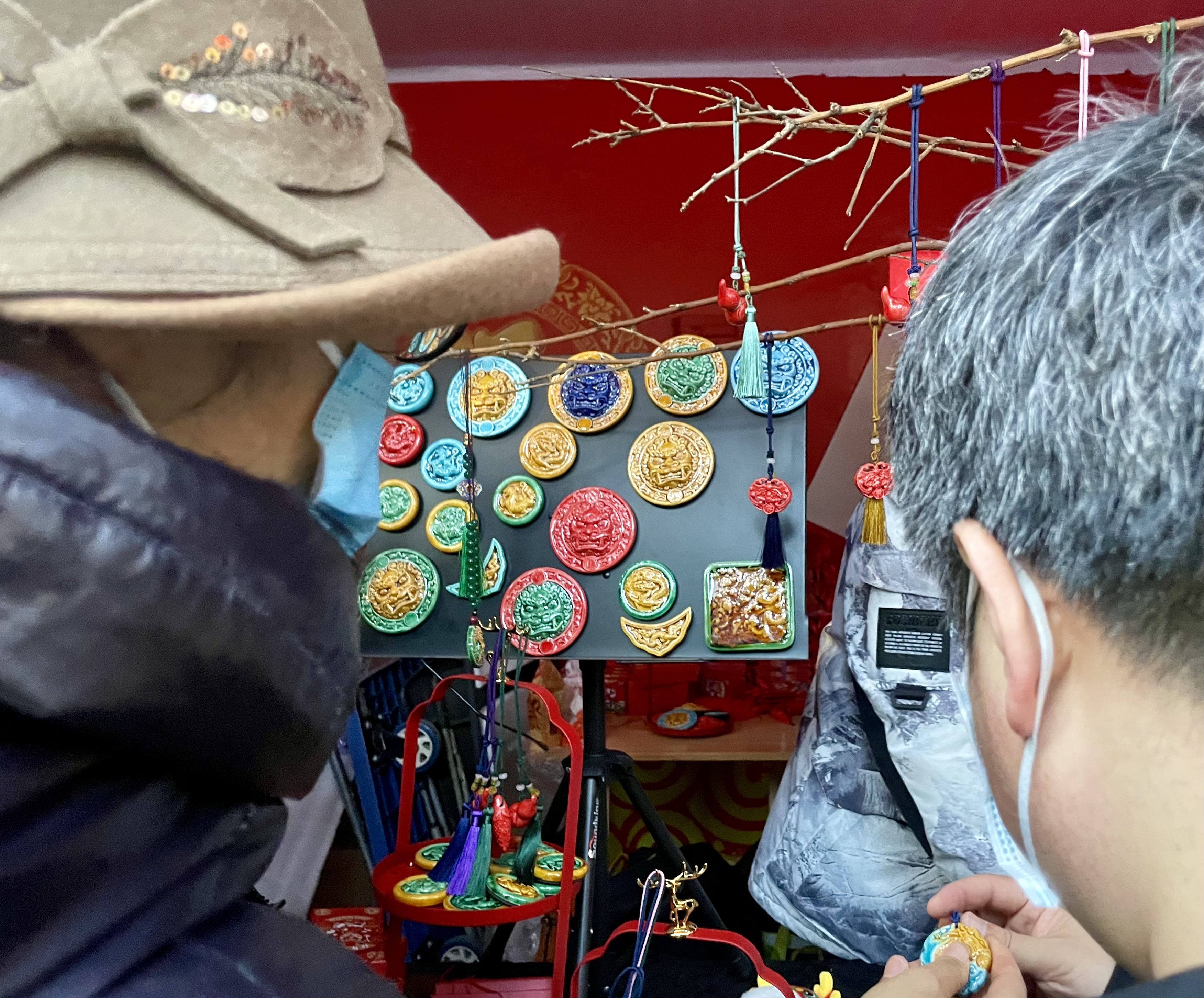 “这款吊坠好特别,材质真像方泽坛那边的琉璃瓦!”在一处非遗文创摊位前,小姑娘彤彤停下脚步,仔细打量展台上的产品。“对,这款吊坠就是琉璃做的,平安扣的造型上融入鱼化龙形象,取名‘独占鳌头’。”作为北京市工艺美术大师、门头沟区皇家琉璃文创创始人,刘婷赫特意来到庙会现场,为市民介绍被列入国家级非遗名录的琉璃烧制技艺。