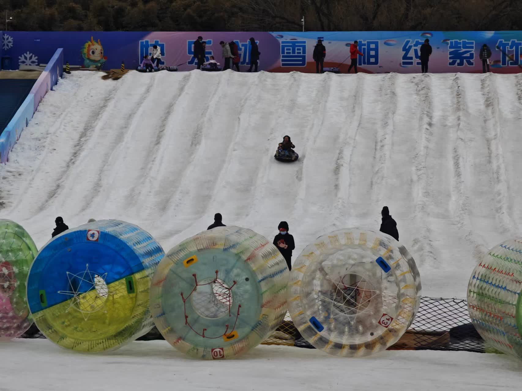 2月14日,游客在紫竹院公园玩雪上飞碟、雪地悠波球等雪上娱乐项目,抓住冬天的尾巴,尽享雪上的快乐。