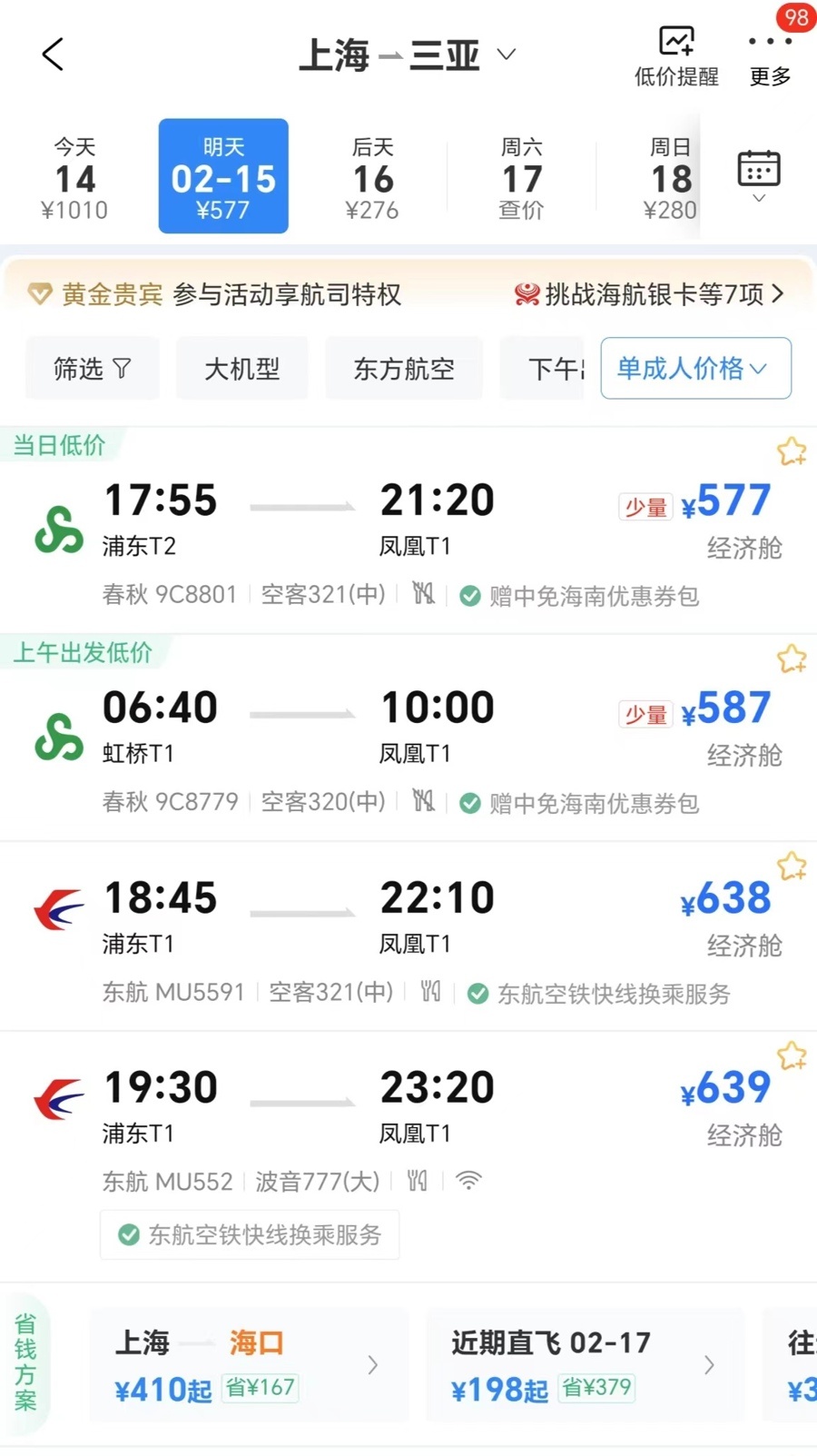 2月15日,上海-三亚去程航班最低577元。