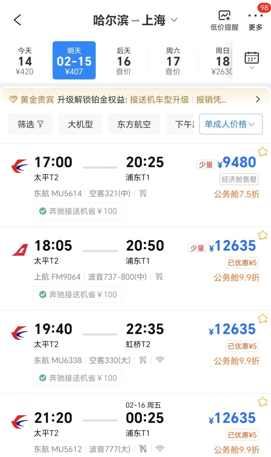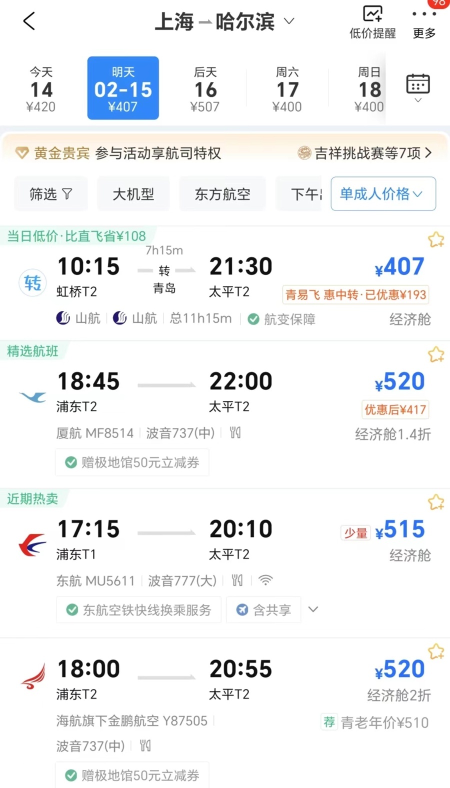 2月15日,哈尔滨飞上海直飞机票最低9480元,最高12635元。均截屏图片