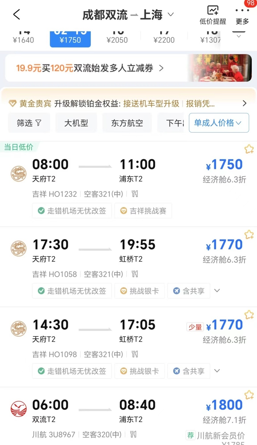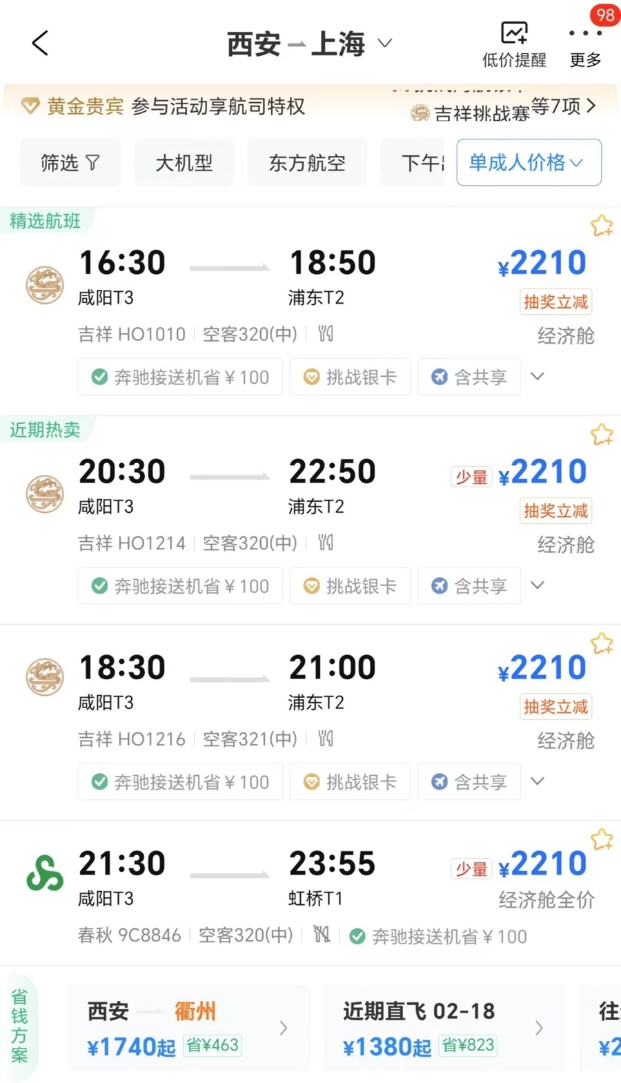 2月15日,春节热门旅游目的地成都、西安飞上海仍可买到经济舱机票,成都返沪航线机票有折扣。均截屏图片