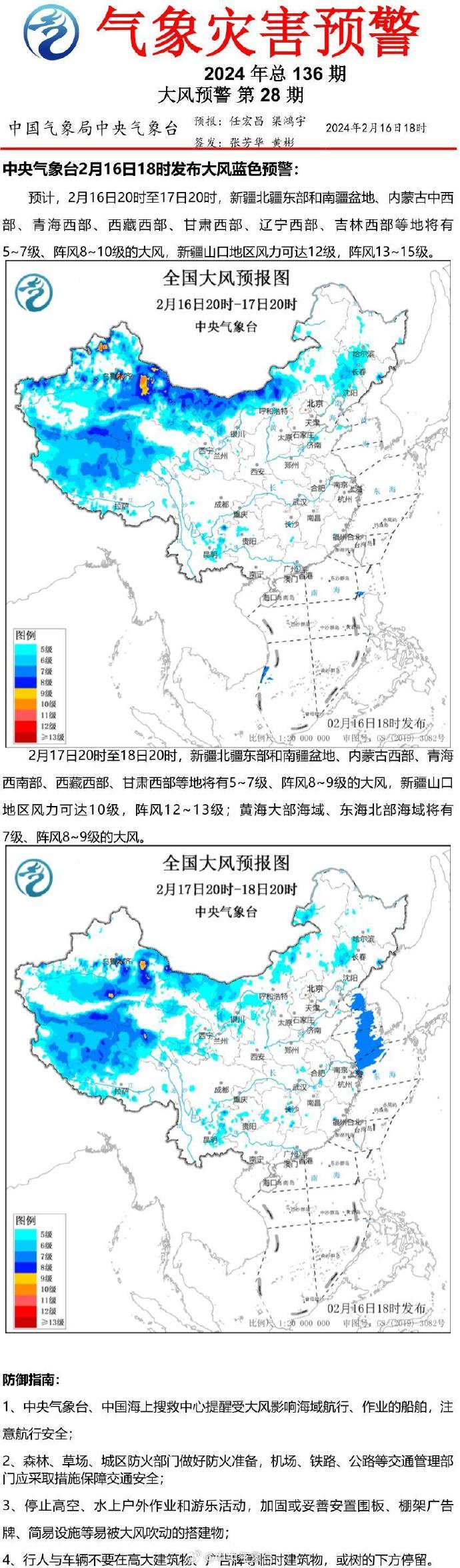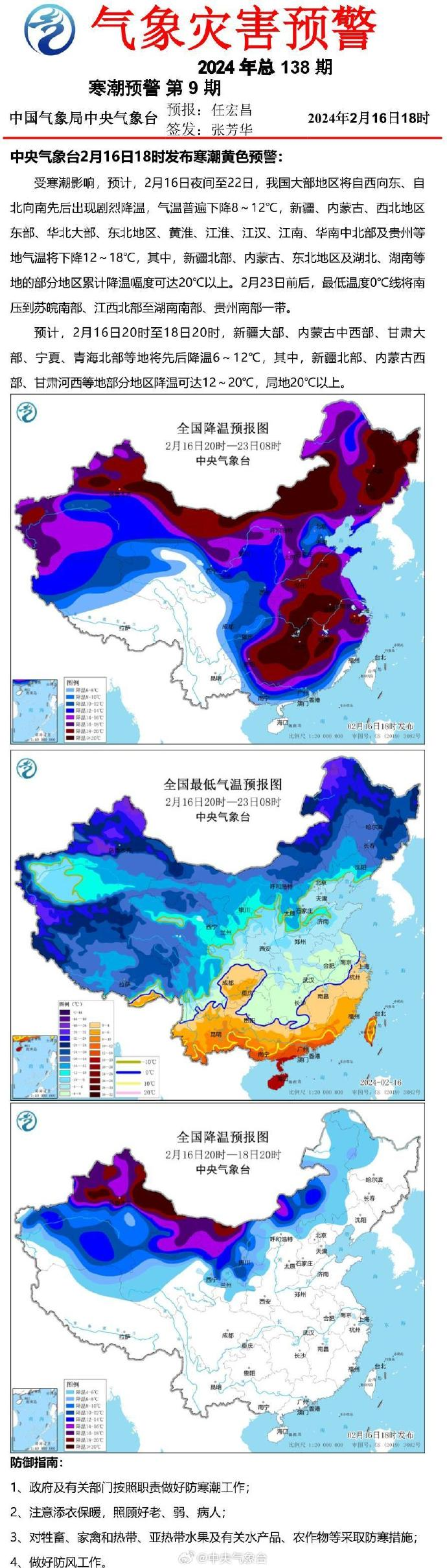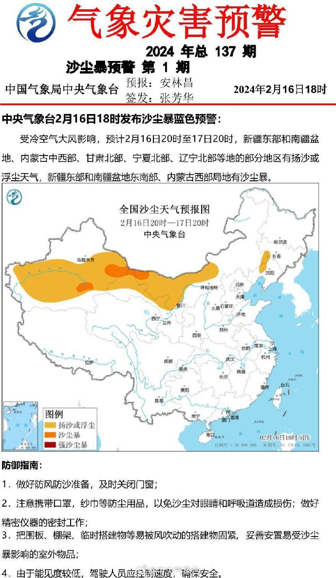 中央气象台2月16日18时发布寒潮黄色预警、大风蓝色预警、沙尘暴蓝色预警。