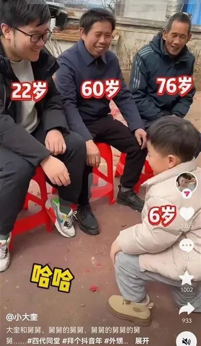 视频中,一名男孩和三名男子坐成一排,三名男子的年龄分别被标注为22岁,60岁和76岁。小的依次向大的喊“舅舅新年好”,大的给小的发红包。博主在评论区配文称,“外甥和舅舅四代同堂。”
