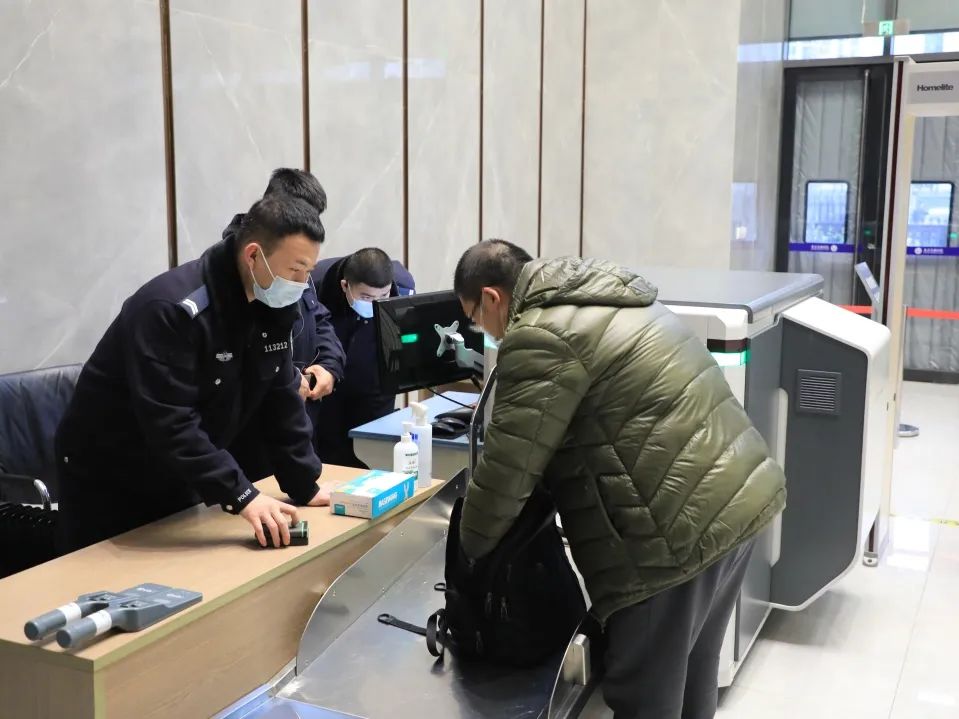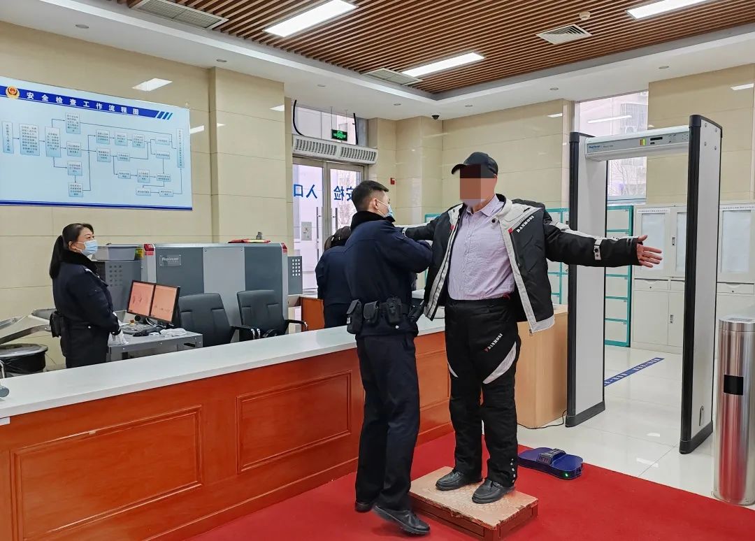 东城法院、门头沟法院法警精神饱满、认真履职,对来院参加诉讼的当事人开展安全检查。