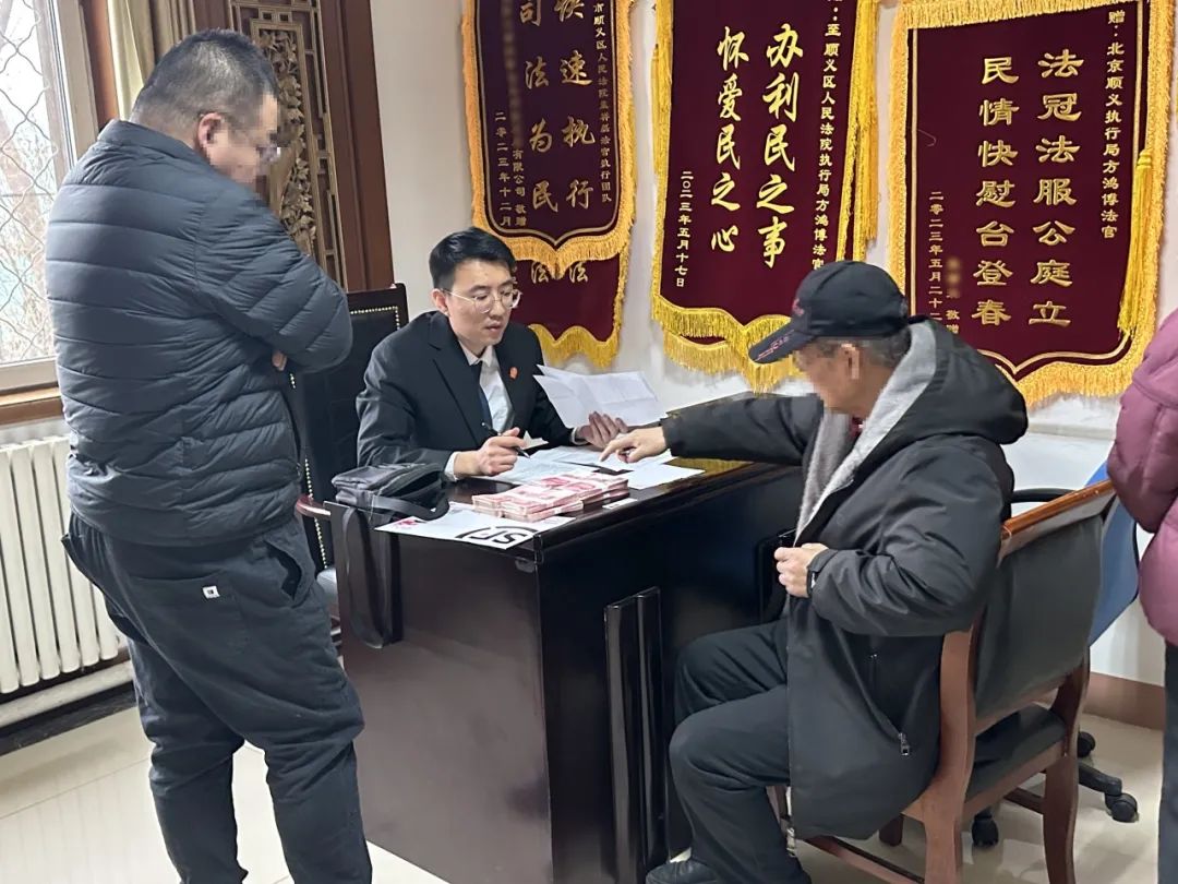 顺义法院执行局干警谭信积极协调被执行人来院履行,不会使用智能手机、不懂信息系统的老年申请执行人当场收下8万元执行案款。