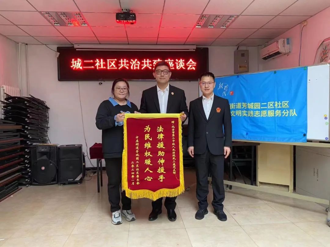 北京二中院民三庭赴对口共建社区芳城园二区开展座谈交流,社区赠送“法律援助伸援手,为民维权暖人心”锦旗,表达对二中院在社区治理、普法服务、组织居民旁听庭审等方面提供服务和帮助的感谢。