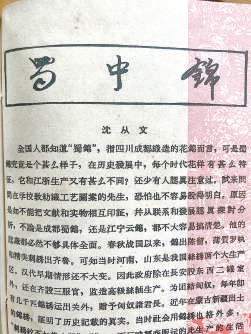 同年5月,沈从文的《谈皮球花》在《装饰》第5期发表,这篇文章不但配有大篇幅的精美彩印图片,而且还有沈从文以章草书写了标题,可谓是相得益彰。很多含有皮球花图案的图片也都是来自于故宫收藏以及新收集的瓷器、丝织类文物。同样,《蜀中锦》这篇论文,在《装饰》第6期发表也是如此操作,可以说这本杂志对于沈从文发表工艺品论文非常得心应手。