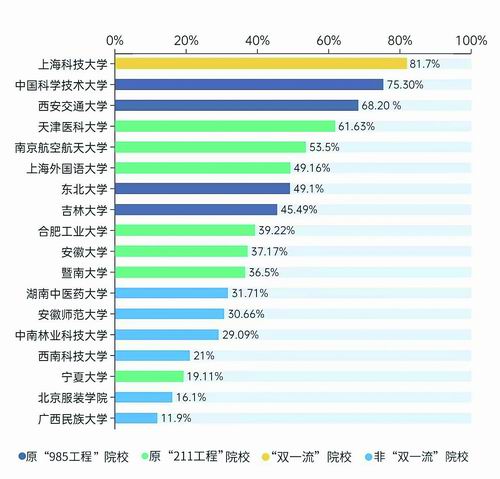 在本文考察的院校中,留在院校所在省域工作者占比在70%~80%的院校有上海科技大学(75.76%)、暨南大学(75.8%);占比在60%~70%的院校有宁夏大学(68.58%)、广西民族大学(68.3%)、湖南中医药大学(67.65%)、安徽师范大学(66.52%),以及安徽大学(63.72%);占比在35%~55%的院校有西南科技大学(54.40%)、合肥工业大学(46.54%)、中南林业科技大学(38.37%)。
