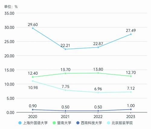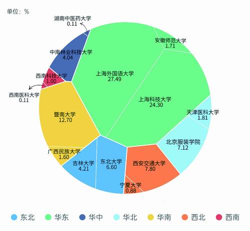 与之类似的还有北京服装学院,该校本科毕业生出国出境深造率占总体升学率的近五成。位于华南地区的暨南大学,其本科毕业生总体升学率为36.5%,出国出境深造率为12.7%,亦即近1/3的本科毕业生选择留学。