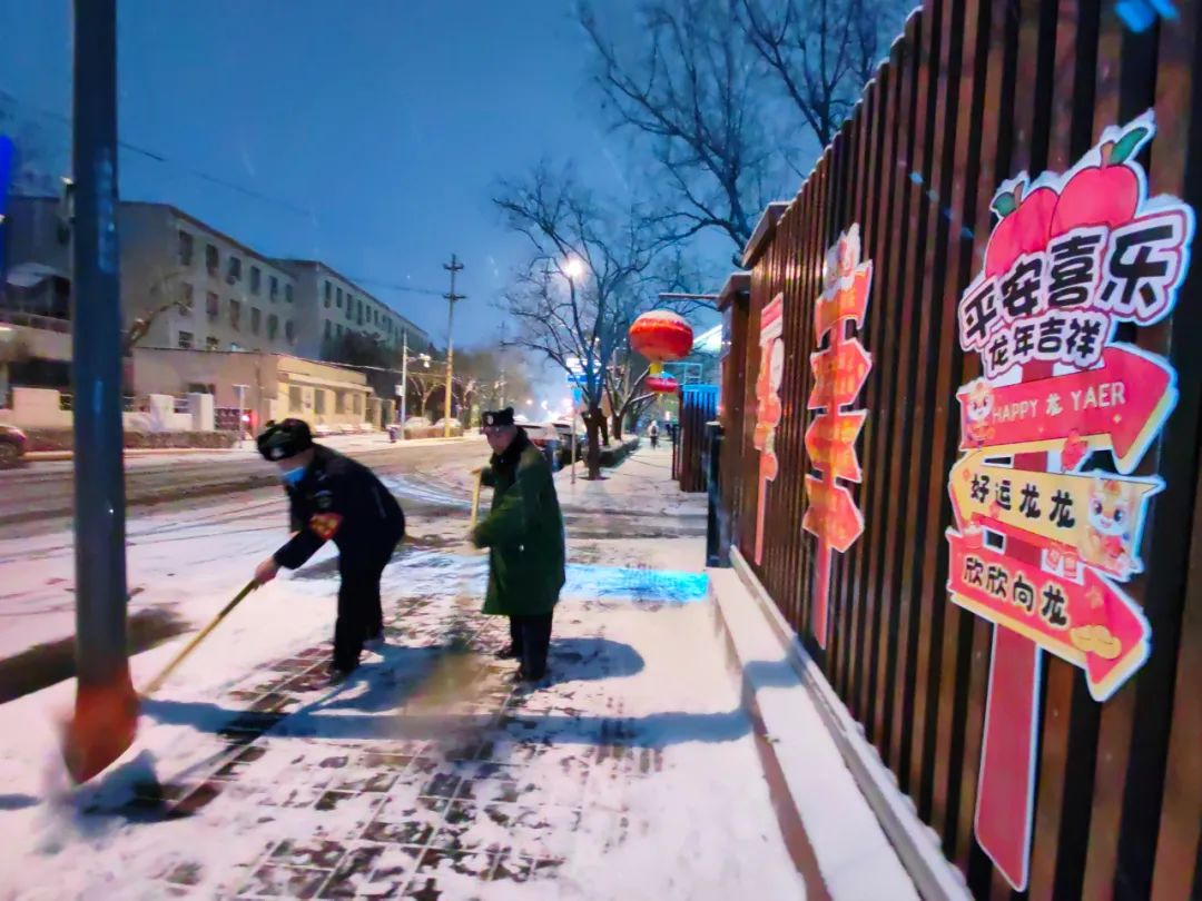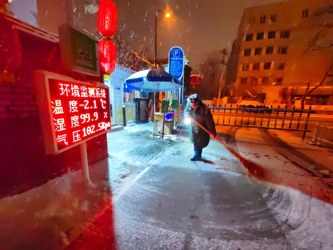 记者在石景山区八角南路社区看到,社区的道路上已经覆盖了一层白雪,社区工作者和部分商户,社区保安开始清扫积雪。