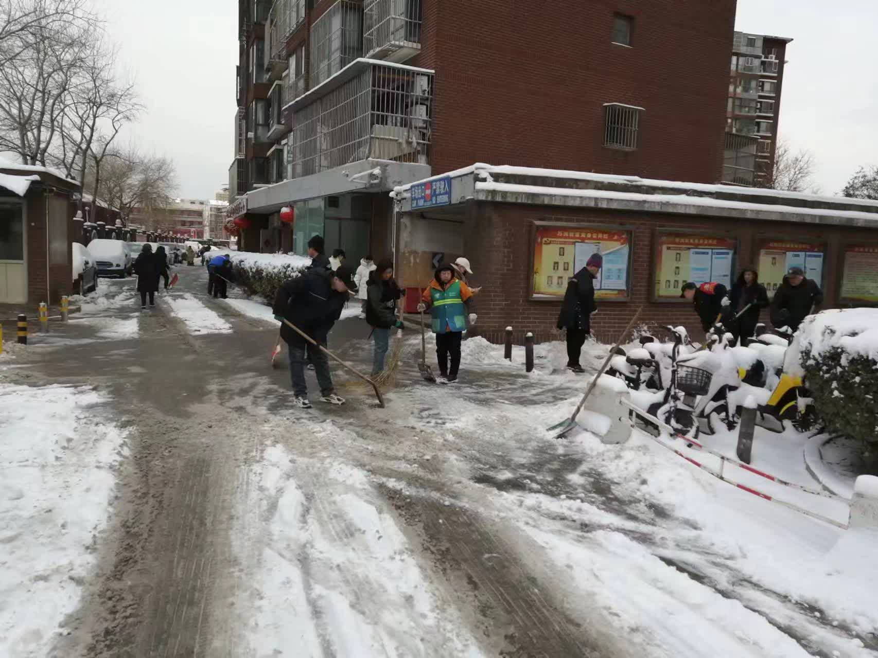 早上7时许,社区的十名工作人员和物业十多名工作人员,拿起雪铲、扫把等工具出动,继续清除道路上的积雪。虽然室外温度很低,大家的手都被冻得通红,却丝毫没有影响清除积雪的热情。在大伙儿齐心协力下,一条条道路被清扫干净。