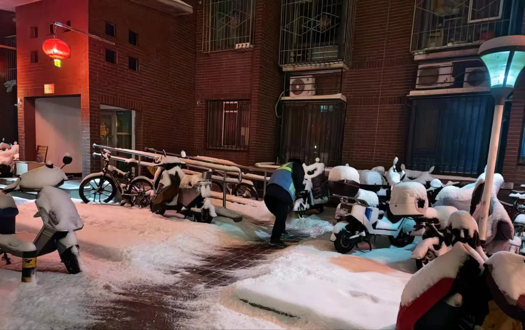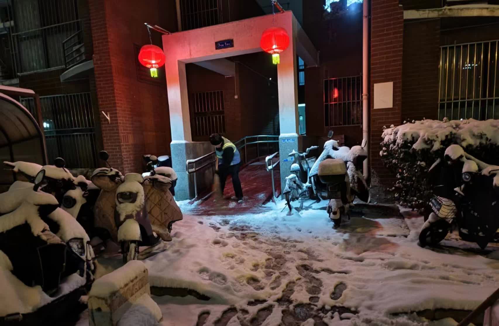 一夜大雪过后,路面积雪给今晨出门上班的市民带来不便。多个小区的物业人员从昨晚开始便奋战在扫雪一线,用人力拉车撒融雪剂、扫雪机除雪等方式,“人机结合”连夜扫雪铲冰,保障上班族安全通行。