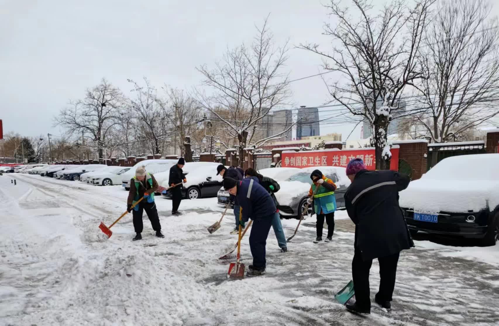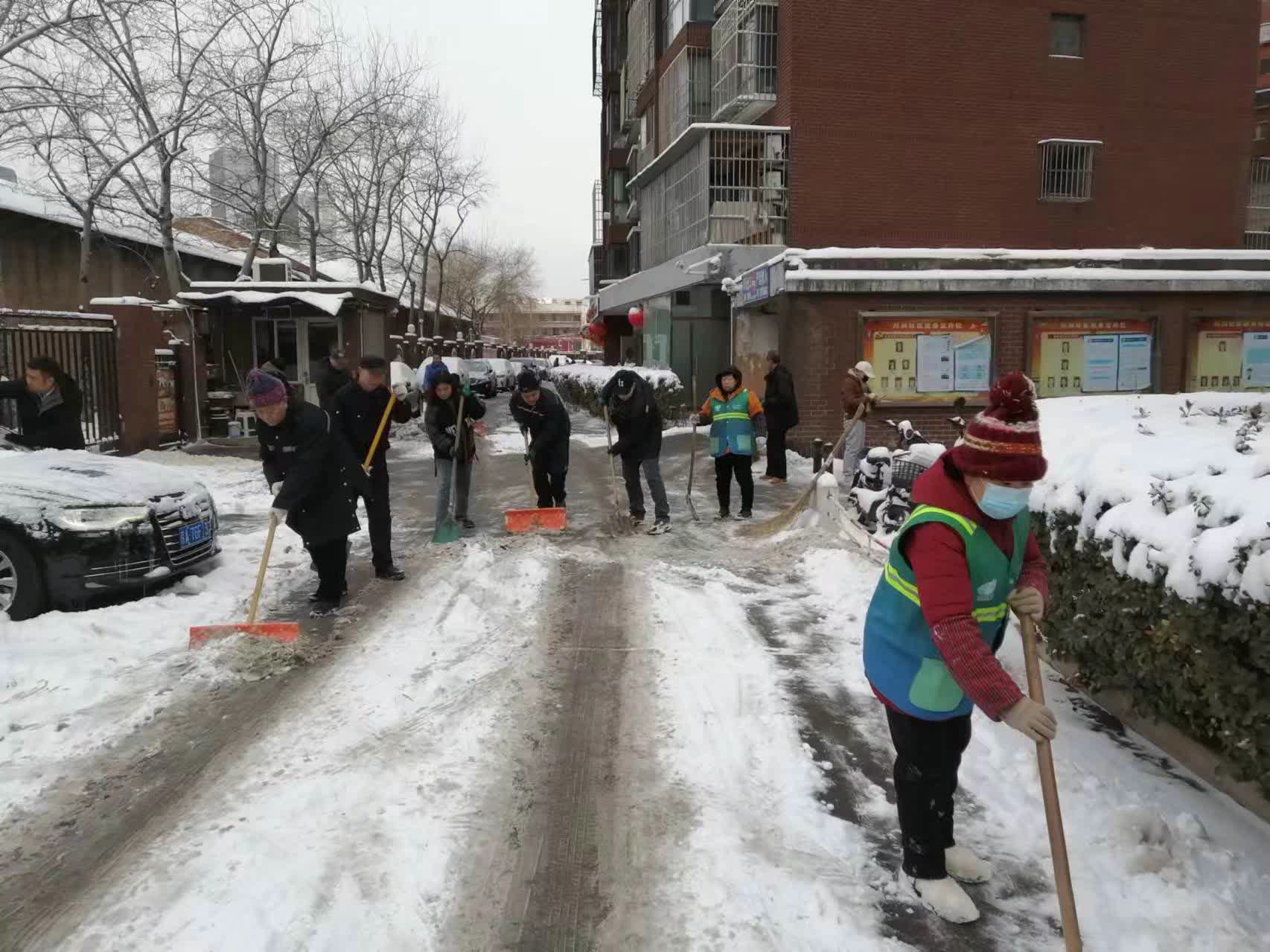凌晨3时30分,几乎没怎么休息的物业人员又开始扫雪了。他们要赶在上班的居民出门前,将9栋楼单元门口的积雪都清除干净,保障居民安全出行。早上7时,物业和社区工作人员全部提前上岗,加入到清扫积雪的队伍中来。大家分区行动,沿小区道路一刻不停地清扫。拿着铁锹的人打头阵,先把路面上被压实的雪铲起来,几人在后方拿着大雪铲并排着向前推。大家干劲十足,忙碌的身影构成了小区里一道亮丽的风景线。