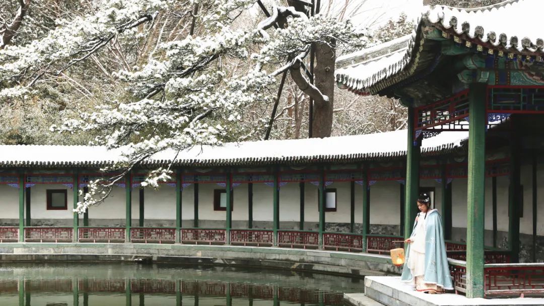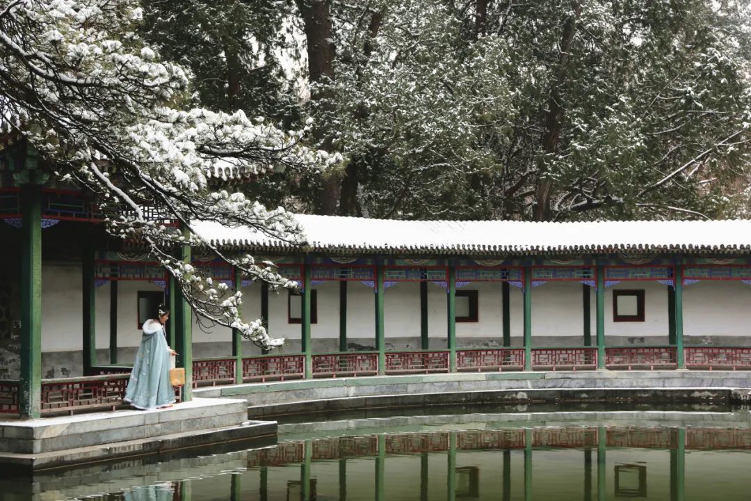 雪抹去了一切杂色,远远望去像是走进了古人的水墨画。