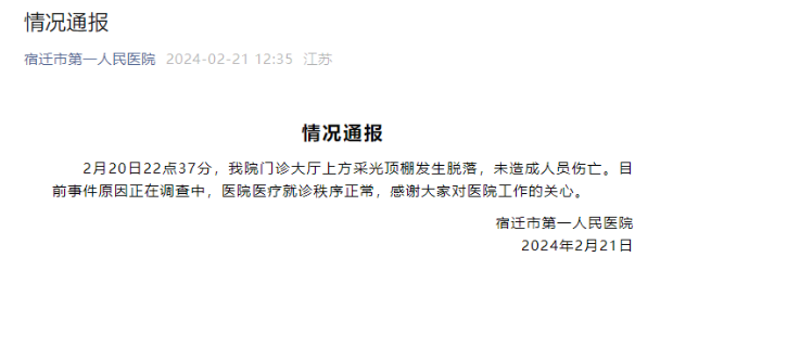 2月20日22点37分,我院门诊大厅上方采光顶棚发生脱落,未造成人员伤亡。目前事件原因正在调查中,医院医疗就诊秩序正常,感谢大家对医院工作的关心。