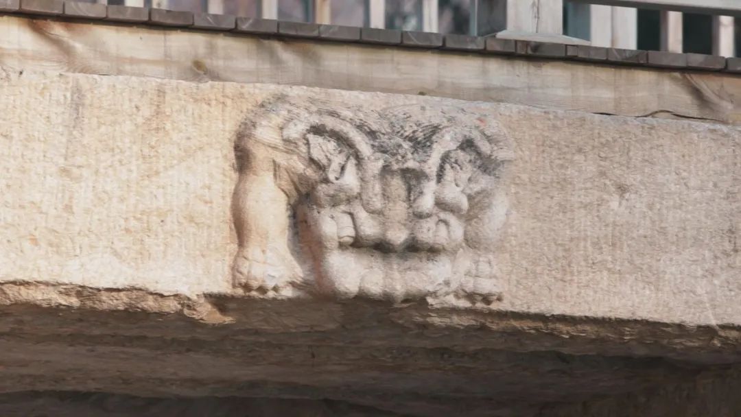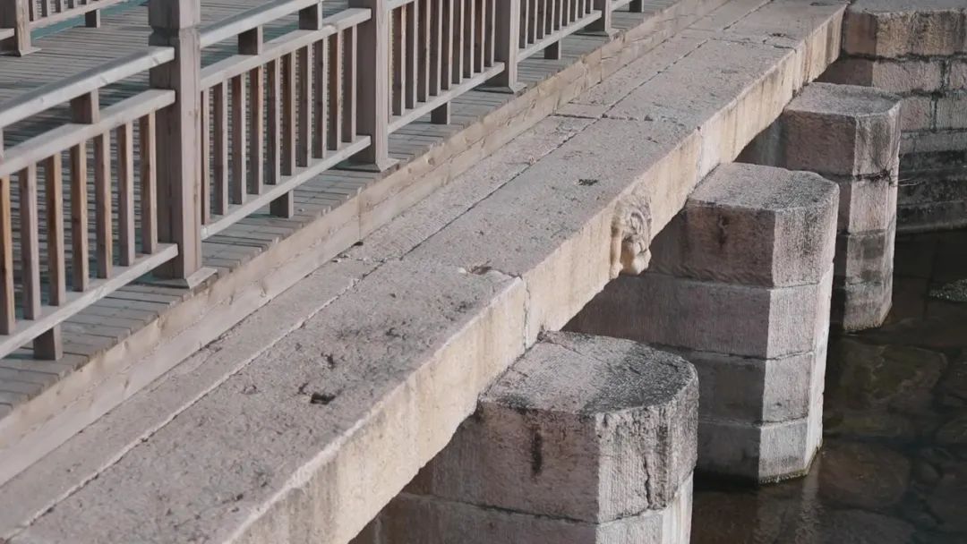 桥梁正中下游方向,雕有石刻龙头。采用剃地起突雕法,石兽头顶长角,双目圆睁注视河床,看上去不怒自威。