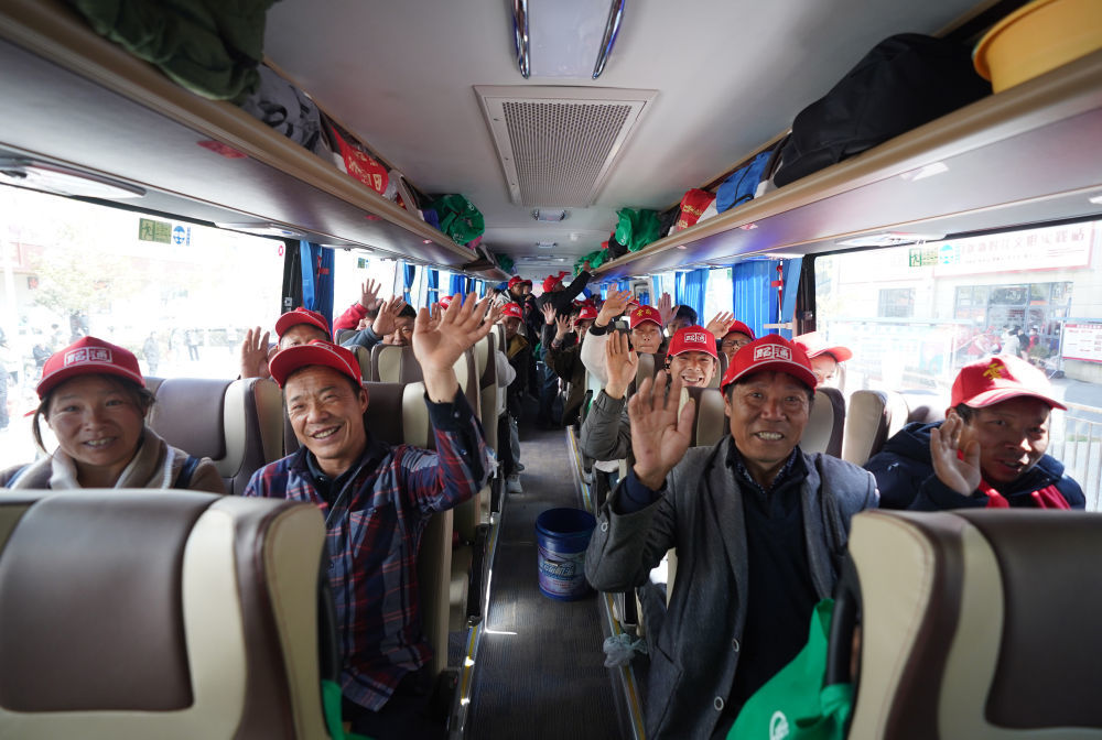 2月21日,在云南省昭通市的务工人员免费乘坐返岗直通大巴车前往福建、广东、江苏等地返岗就业。新华社发(梁志强摄)