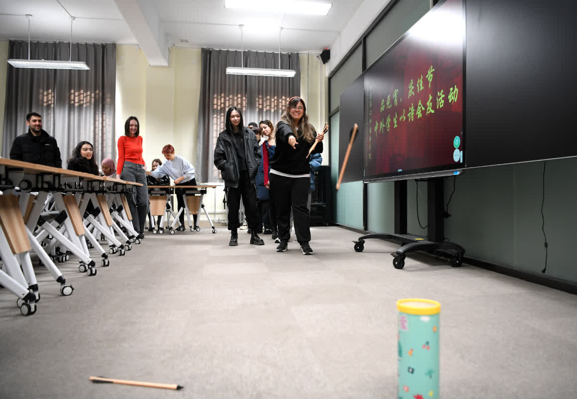 一呼百应,留学生们积极参与。国际学生办公室老师郑雪亭站在一旁,不时帮着递箭。