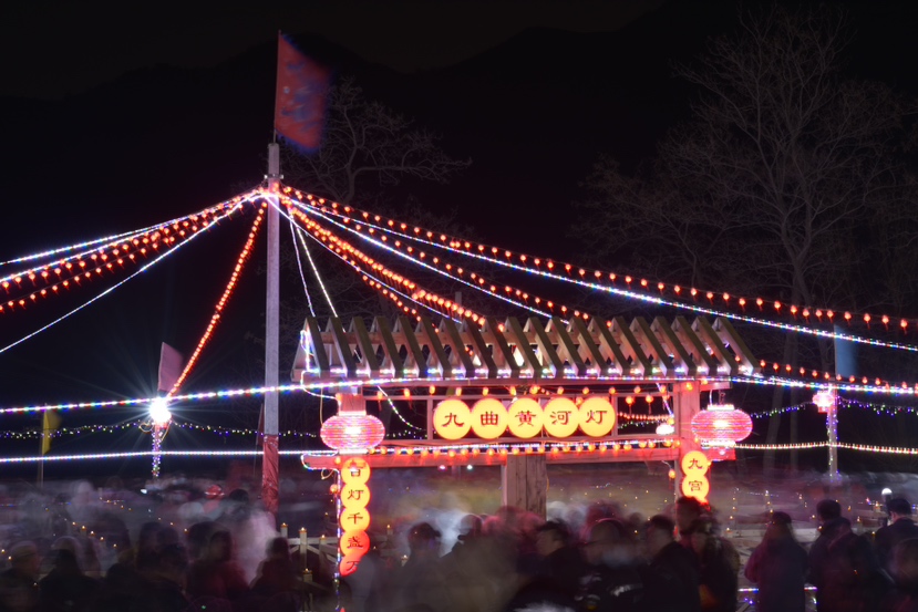 走到永兴寺下的小广场,九曲黄河灯阵气势宏伟。灯阵由361根木条搭建而成,每根立着的杆头放置一盏灯,一根最高的“老杆”立在灯阵中心,“老杆”至灯阵四周由彩灯连接,增添了灯阵的色彩。人们从灯阵中穿行,用手摸一摸“老杆”,还有延年益寿的美好寓意。