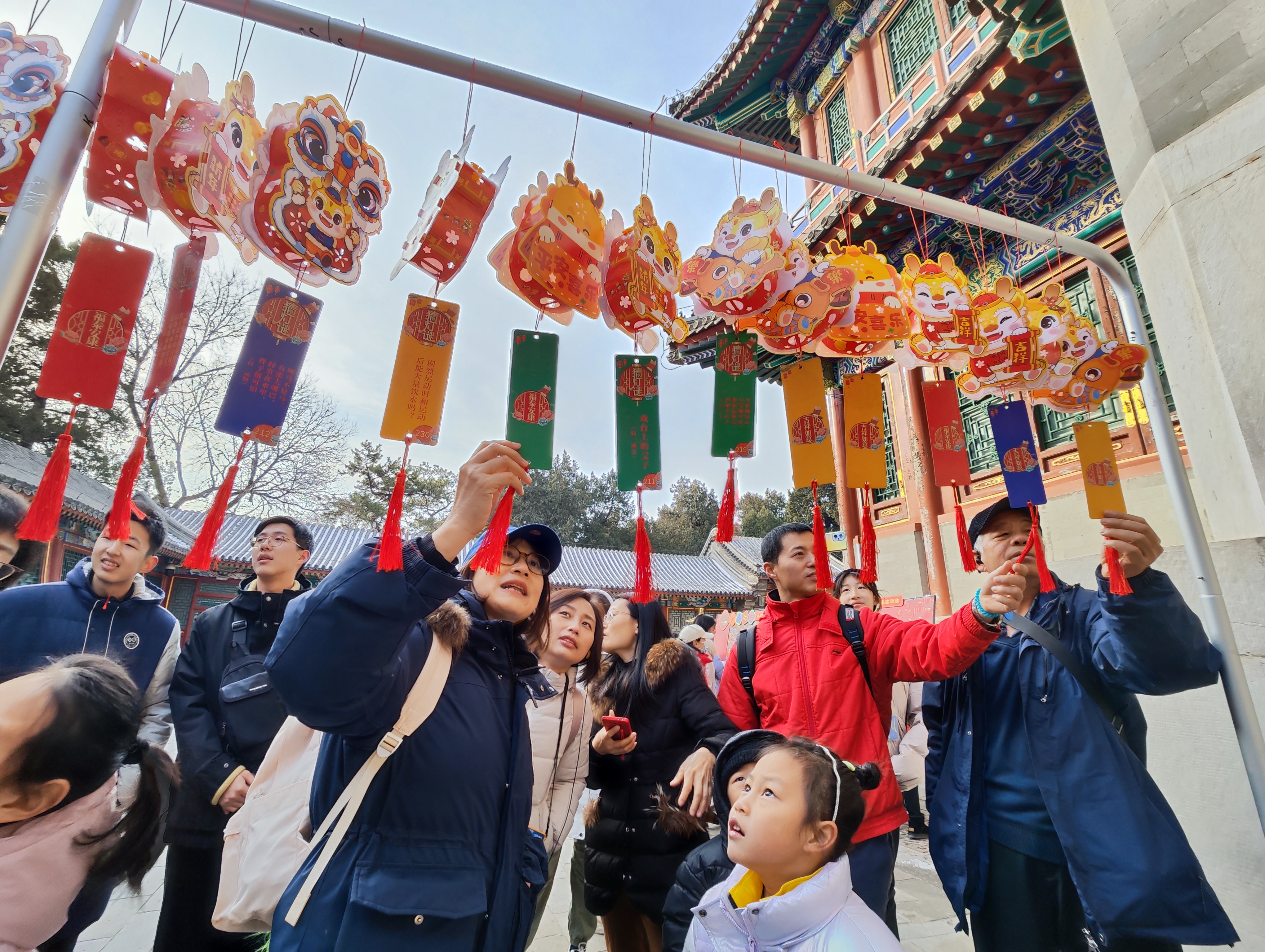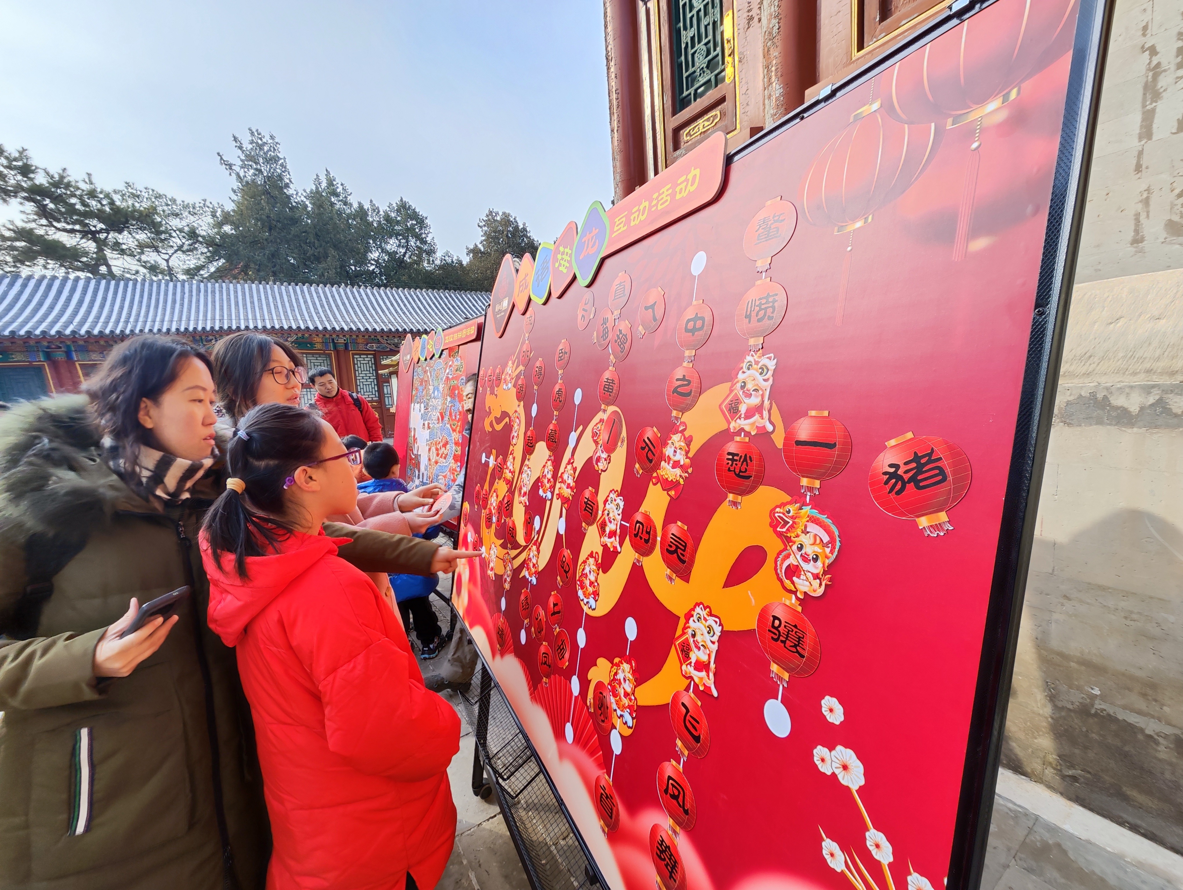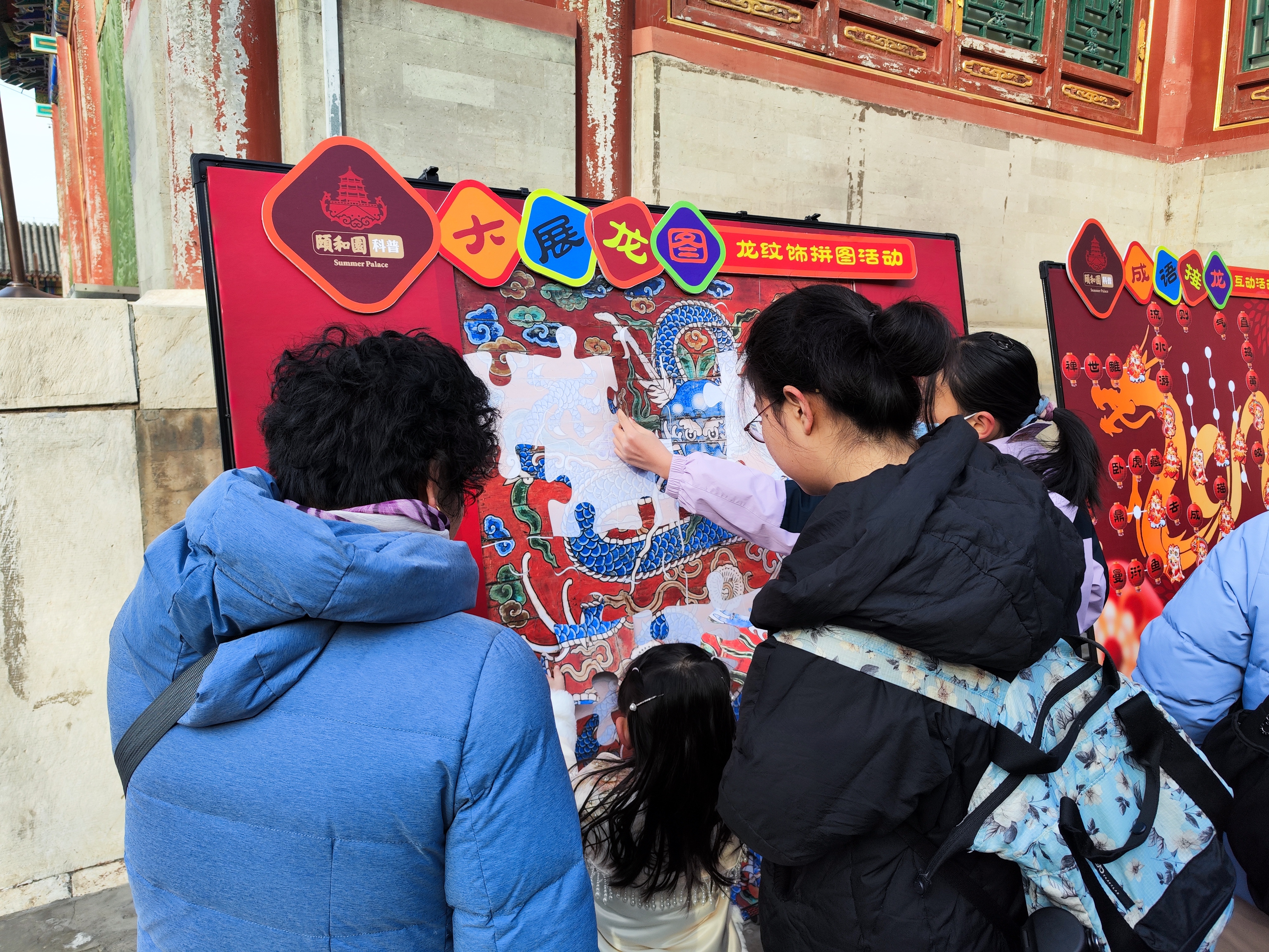一张巨大的拼图吸引了游客李洁和儿子的目光。“这个龙纹样的拼图看着挺容易的,但是孩子试了好几块才找对位置,还有点难度。”李洁说,“我也是听科普老师讲解,才知道这个拼图竟然是大戏台天花的纹样!”元宵节期间,颐和园在4个文化科普活动区域,设置了取材自天花、彩画等文物古建中的三种不同龙纹纹样的拼图和“龙”字成语接龙、猜灯谜体验活动,为举家出游的游客提供了更多选择。