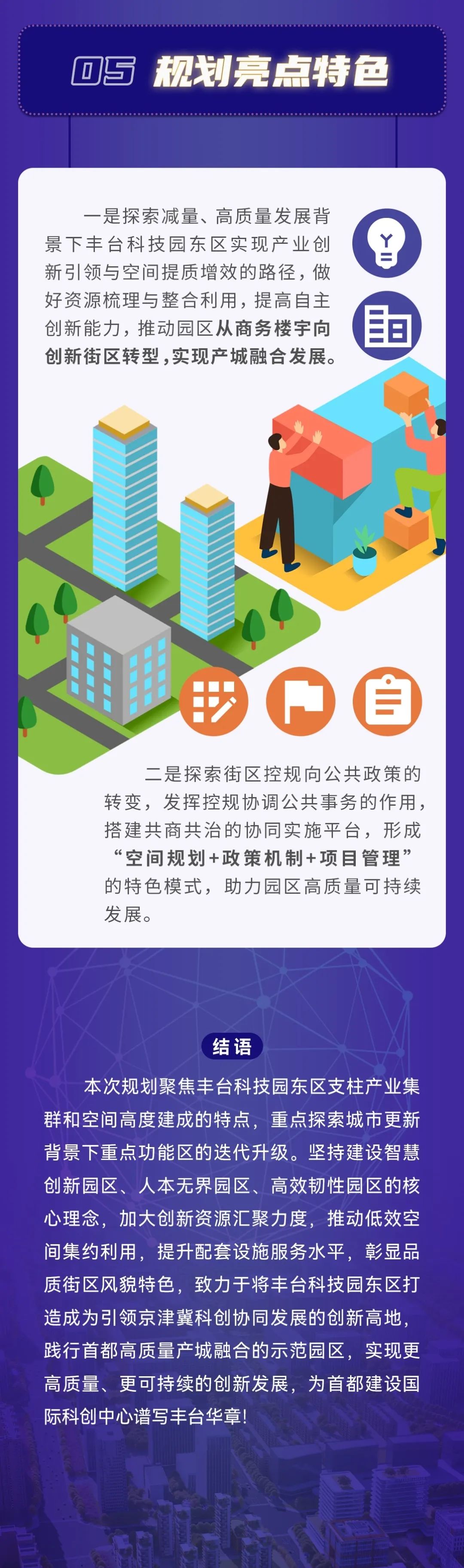 为落实好“创新驱动”国家发展战略、北京国际科技创新中心和“两区”建设要求,紧密协同丰台区“倍增计划”“发展伙伴计划”等要求,着眼于进一步强化丰台科技园东区产业创新引领与空间提制增效,北京市规划和自然资源委员会、丰台区人民政府共同组织编制了《北京市丰台区丰台科技园东区FT00-1522、1523街区控制性详细规划(街区层面)(2022年—2035年)》(草案)。根据《中华人民共和国城乡规划法》(中华人民共和国主席令第七十四号)、《北京市城乡规划条例》的有关规定,现对规划成果进行公示,听取公众意见,公示期限30天。