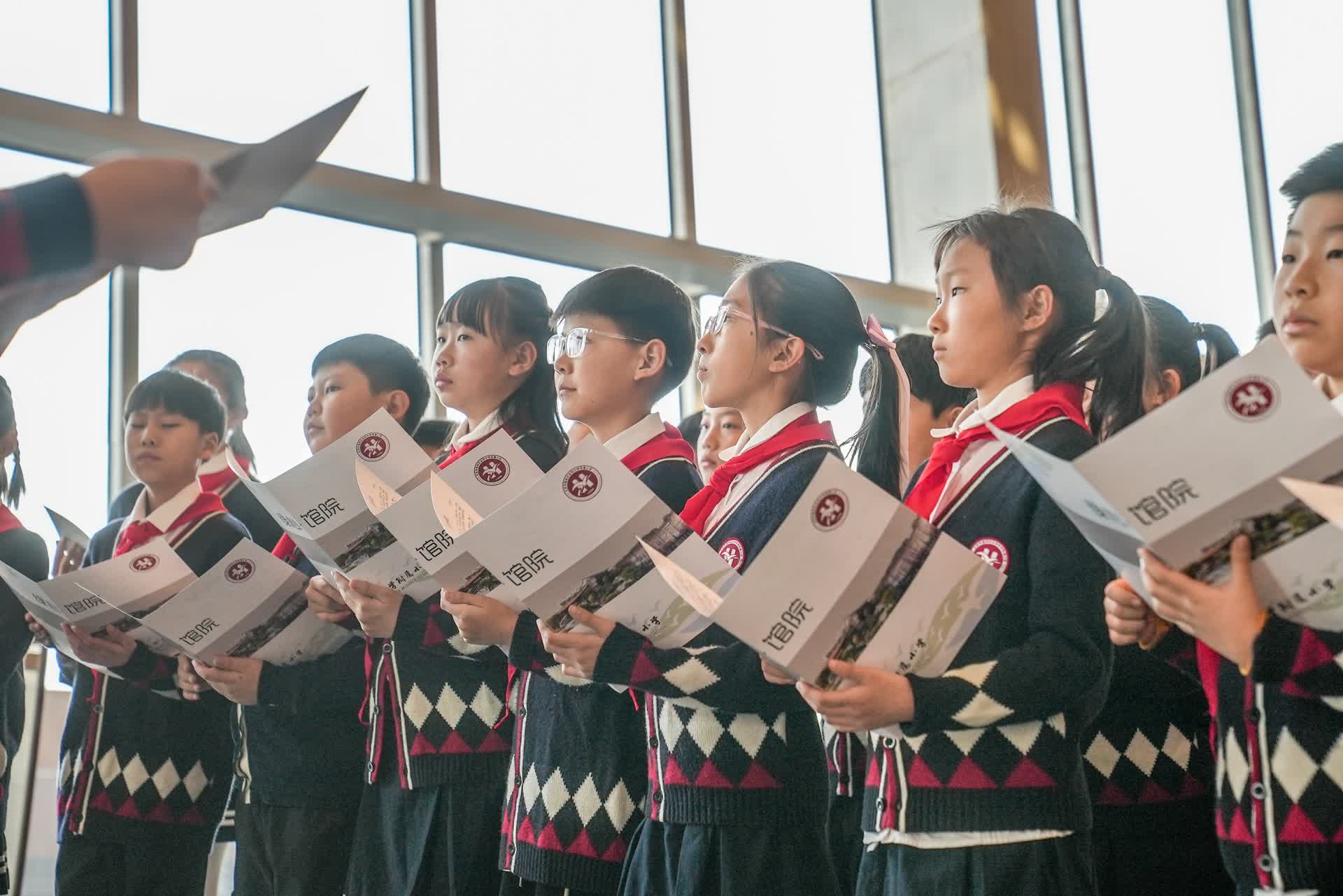 这堂课的主讲人是一群红领巾讲解员。站在观众共享大厅,该校四年级学生李宣颐面向同学们率先开讲:“博物馆内外,处处可见船、帆、水的元素。它将千年运河图景定格在了绿心公园的一片森海之中……我们学校和北京大运河博物馆是邻居,假期里,我和同学参加了博物馆的研学志愿活动,学习了很多知识。希望我们的讲解也能让大家在这里收获更多。”