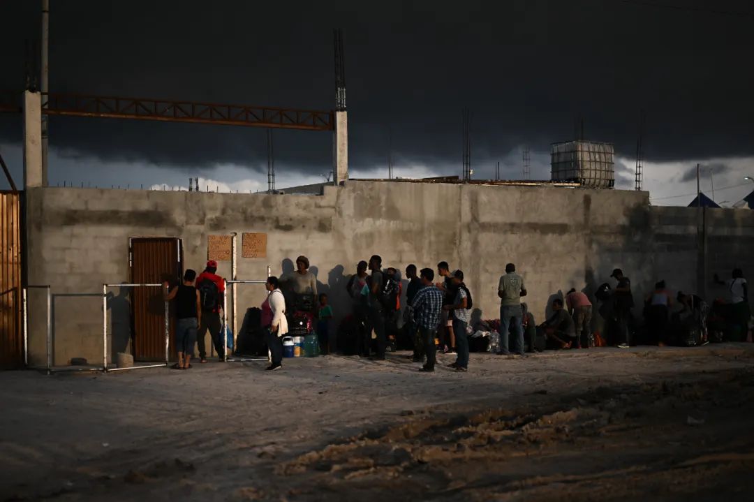 2023年5月16日,移民在美墨边境城市墨西哥雷诺萨的一处收容所外等待进入。新华社记者辛悦卫摄