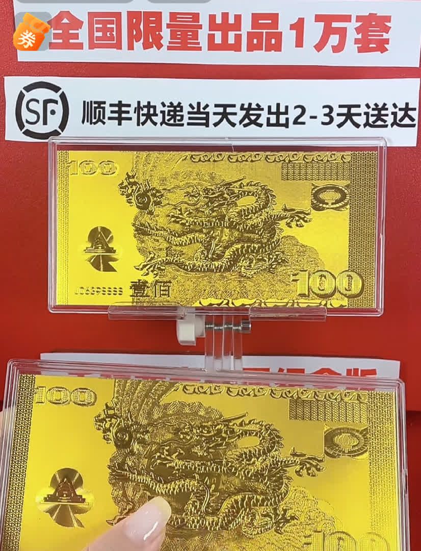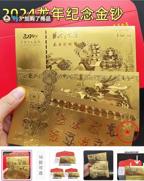 一些直播间里,正在兜售“足金”“足银”类的龙年纪念钞。这些纪念钞,乍一看外形与钱币相差不大,在金银材质的衬托下显得很高大上。记者发现,这些“纪念钞”售价通常比券面所标数字低上一两元,例如标着100的,多售价98、99元。