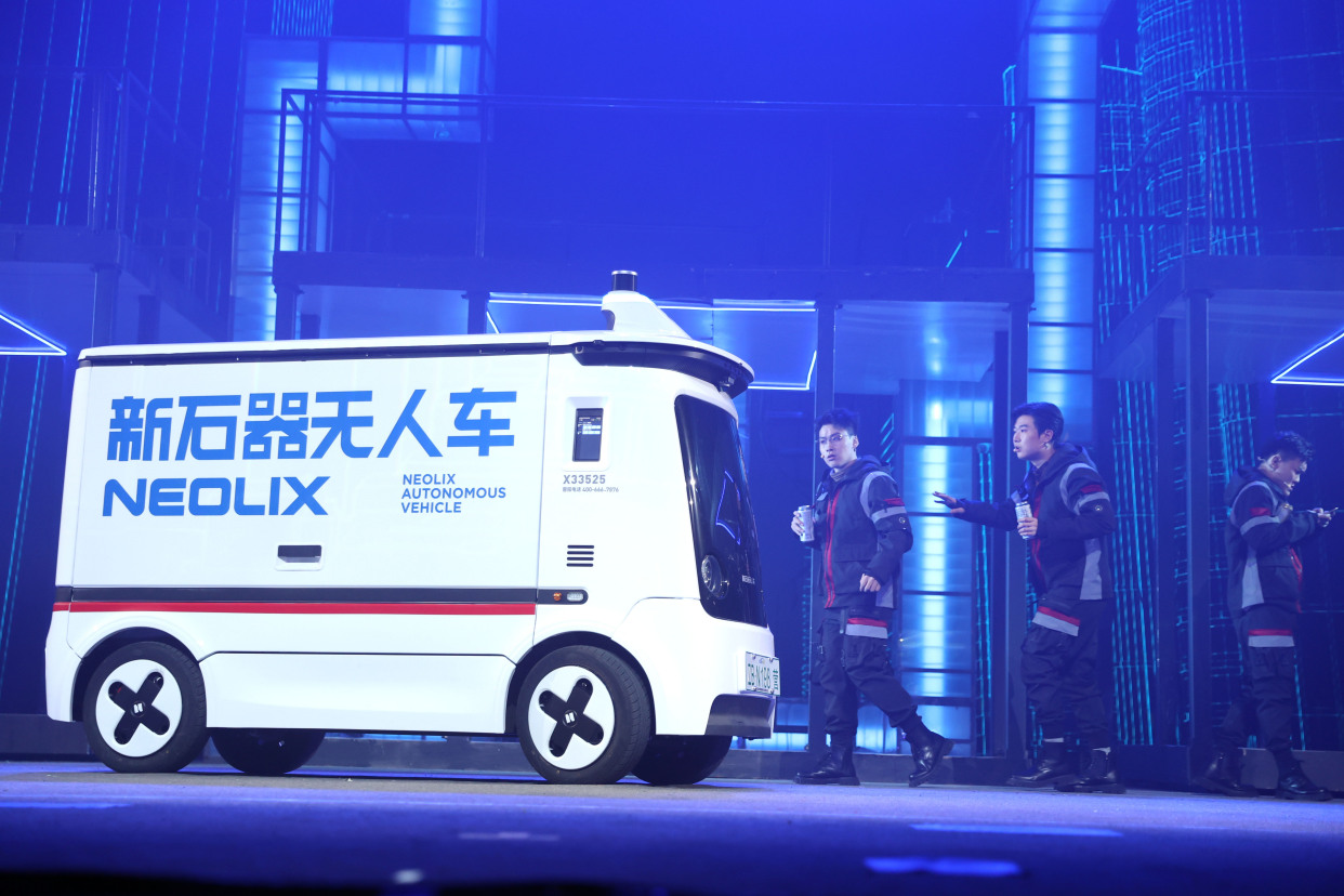 在舞台上,除了“郝杰”“Jessica”“董事长”等人物外,还有一个出场次数不多却极能“抢戏”的角色——来自北京经开区新石器慧通(北京)科技有限公司(以下简称“新石器”)的新石器无人车。在区里,它们被称为“聪明的车”,走上了舞台,它们依然聪明,在向观众展示无人驾驶魅力的同时,还展现了自己能歌善舞的一面,当它用小奶音唱出“我太不容易了/为什么打我;工作了一整天/我也是快递员”时,现场发出了阵阵轻松的笑声。